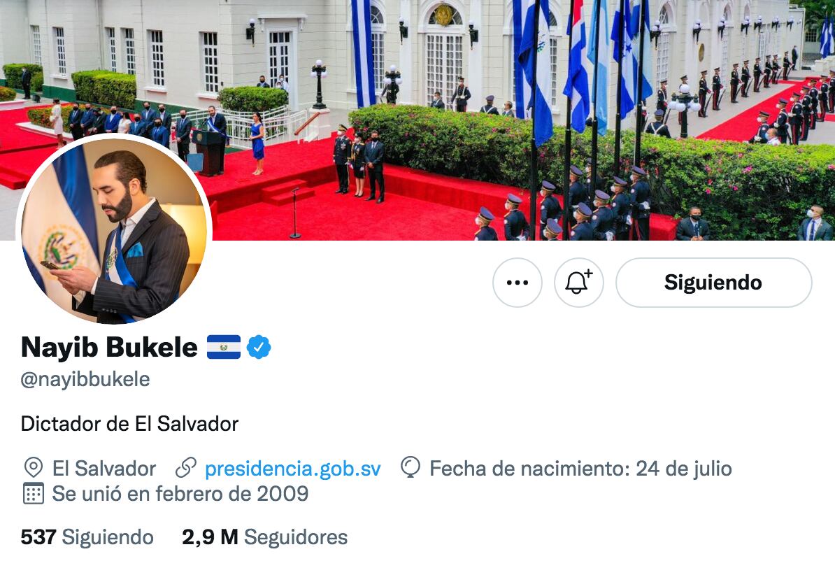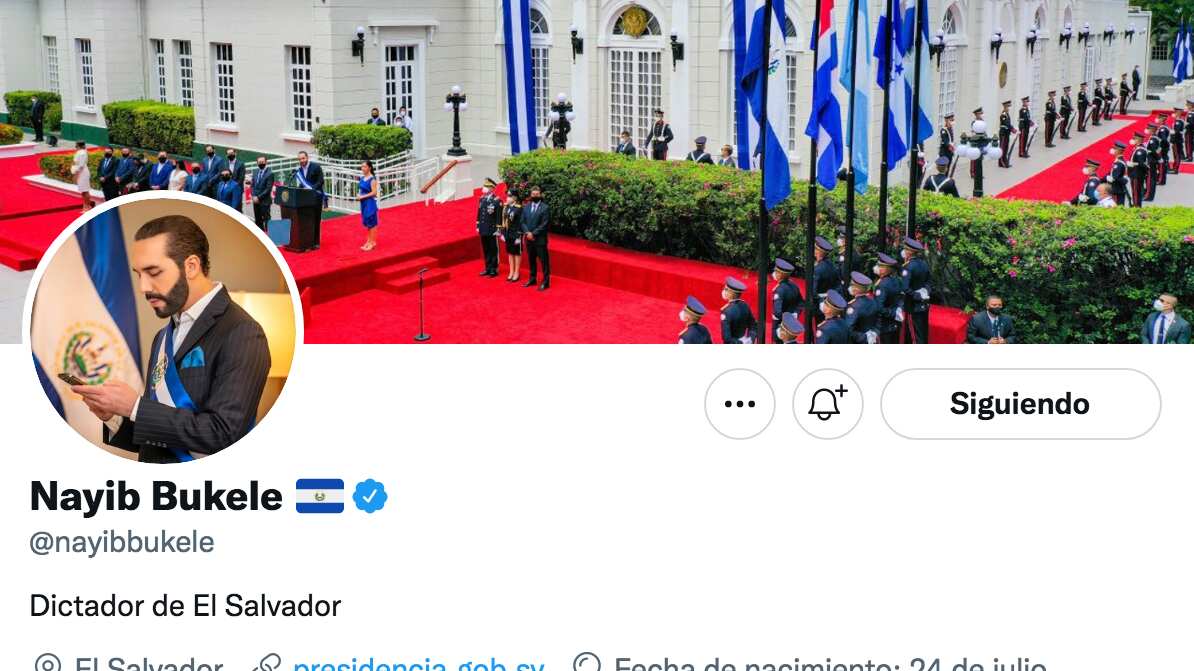 El presidente salvadoreño, Nayib Bukele, cambió la noche de este domingo su biografía en la red social Twitter para describirse como “dictador de El Salvador”.