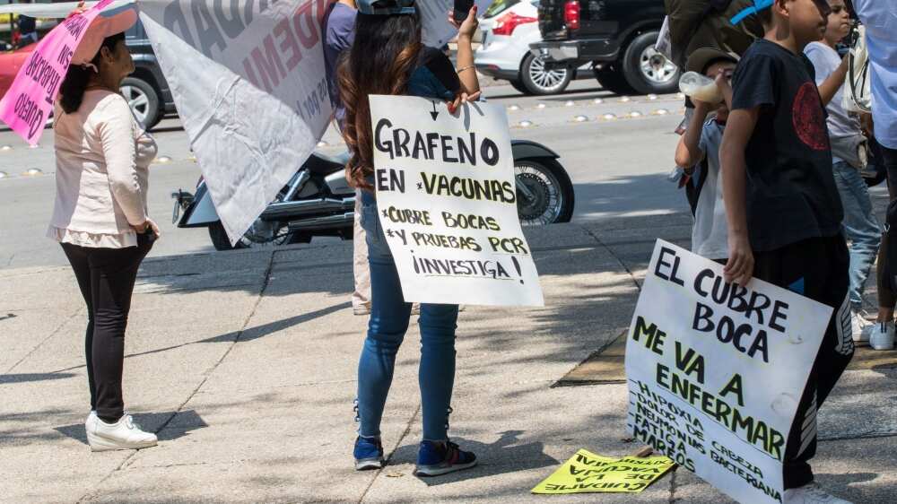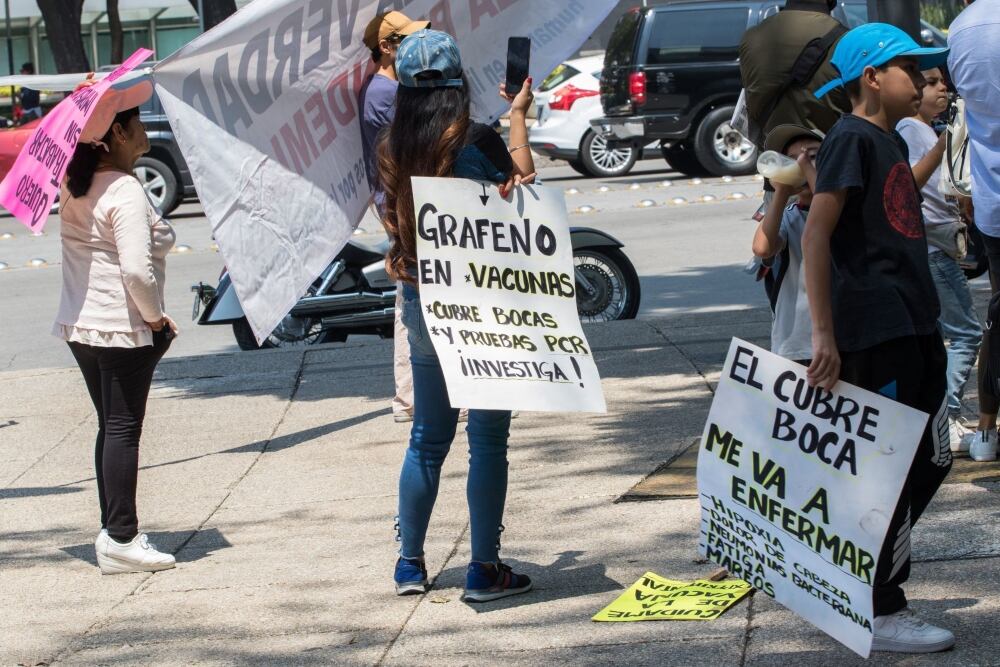 El jueves por la tarde en la Ciudad de México, frente a la sede de la Secretaría de Salud, frente a la Estela de Luz, se manifestaron en contra de la vacunación, ya que afirman que los biológicos contienen elementos nocivos como óxido de grafeno, un sustancia nueva parecida al carbono, al que le achacan los conspiracionistas el factor de contagio del coronavirus, informó Proceso.