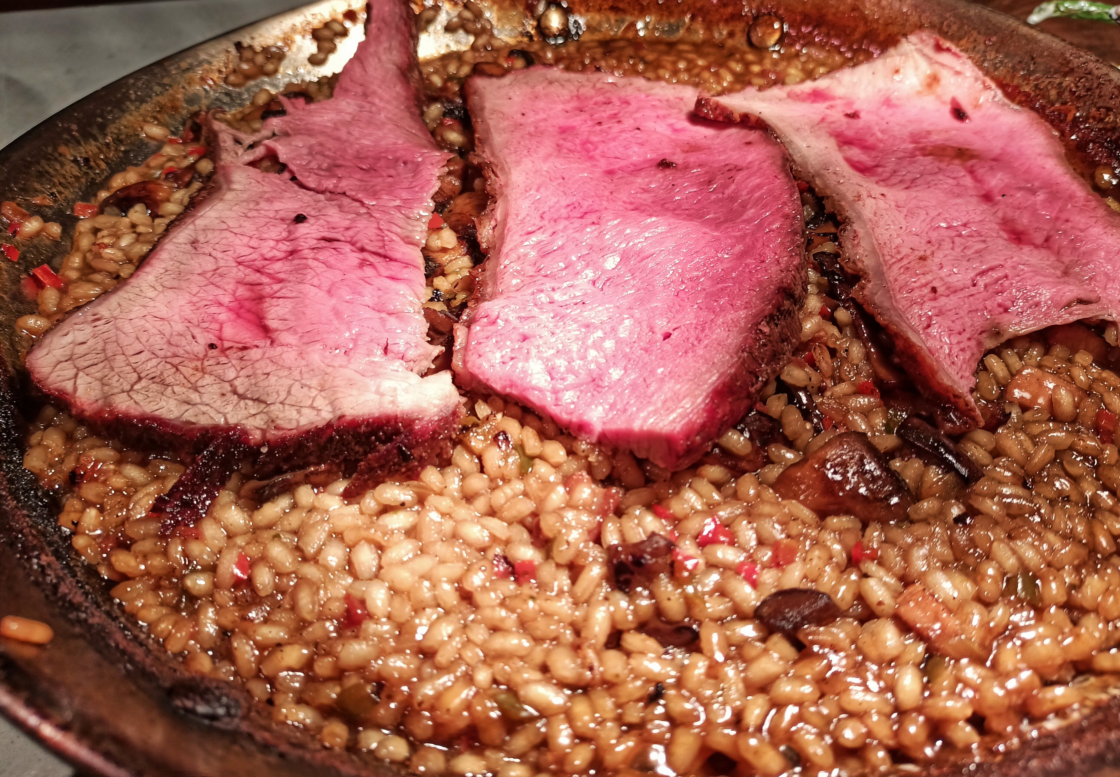 Finalmente, toca el turno a uno de los platos estrella del lugar: la picaña. La pieza entera la colocan en un asador a distancia para que vaya agarrando color y una vez que adquiere un tono rosa, la sacan, rebanan y aderezan con chimichurri de la casa y lo acompañan con guarnición de vegetales a la parrilla y, en esta ocasión, con un puré de berenjena, que muy pocos restaurantes ofrecen. Todo el sabor ahumado y suavidad de la carne se percibe en cada una de las cuatro rebanadas servidas en el plato que seguramente dejará 100% satisfecho a los carnívoros. En verdad, no se debe pasar por alto acudir al lugar solamente para probarlo. Por demás resulta sugerir que se acompañe de una copa de vino a elección y así complementar esta agradable sensación que produce el buen comer.