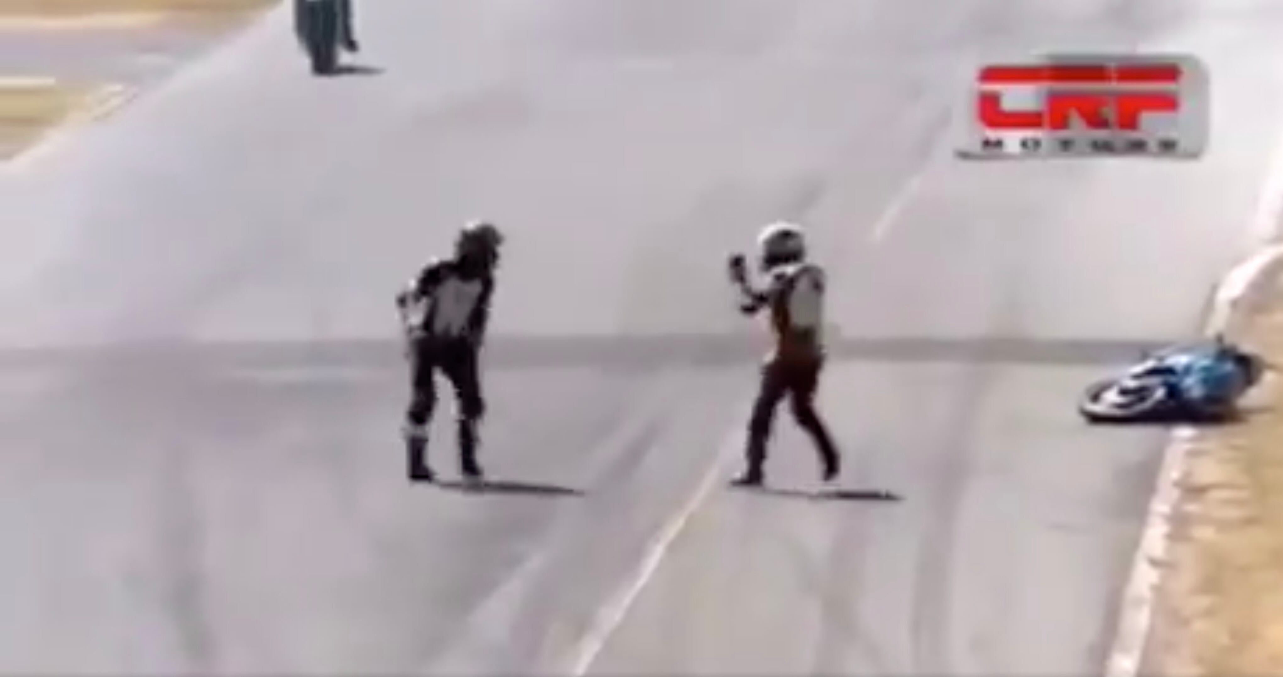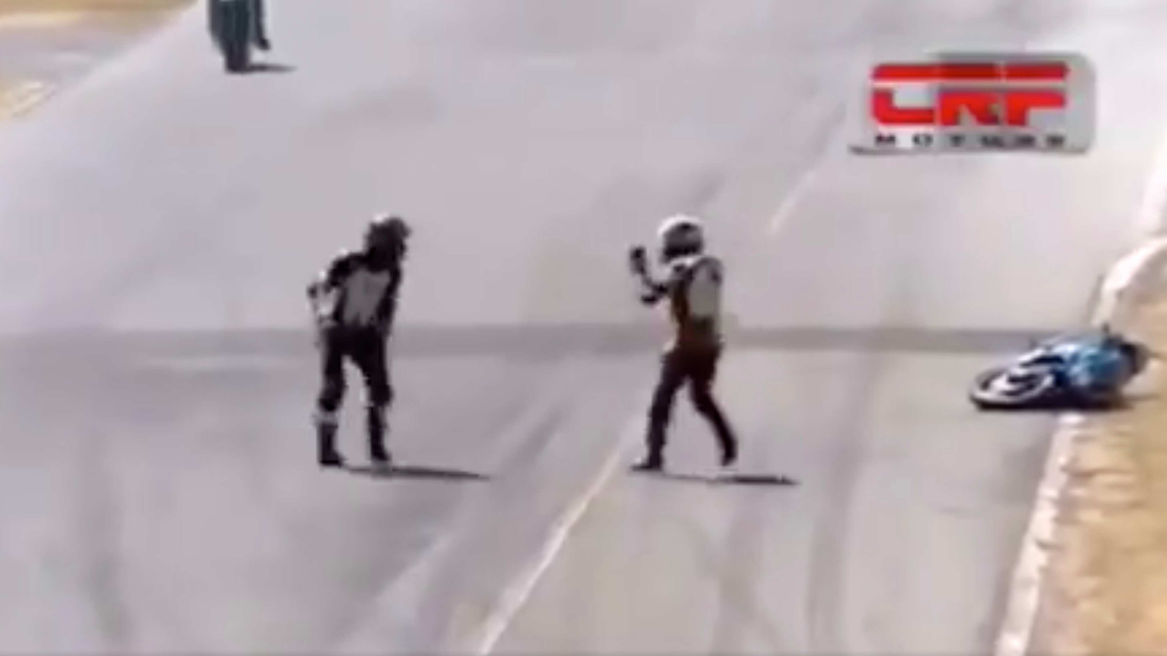 El pleito comenzó cuando ambos motociclistas se cerraron hasta quedar completamente pegados. Uno de los pilotos quedó colgado de la motocicleta de su rival hasta que éste se orilló. El primero se levantó y golpeó en el casco al otro, quien respondió con un puñetazo.