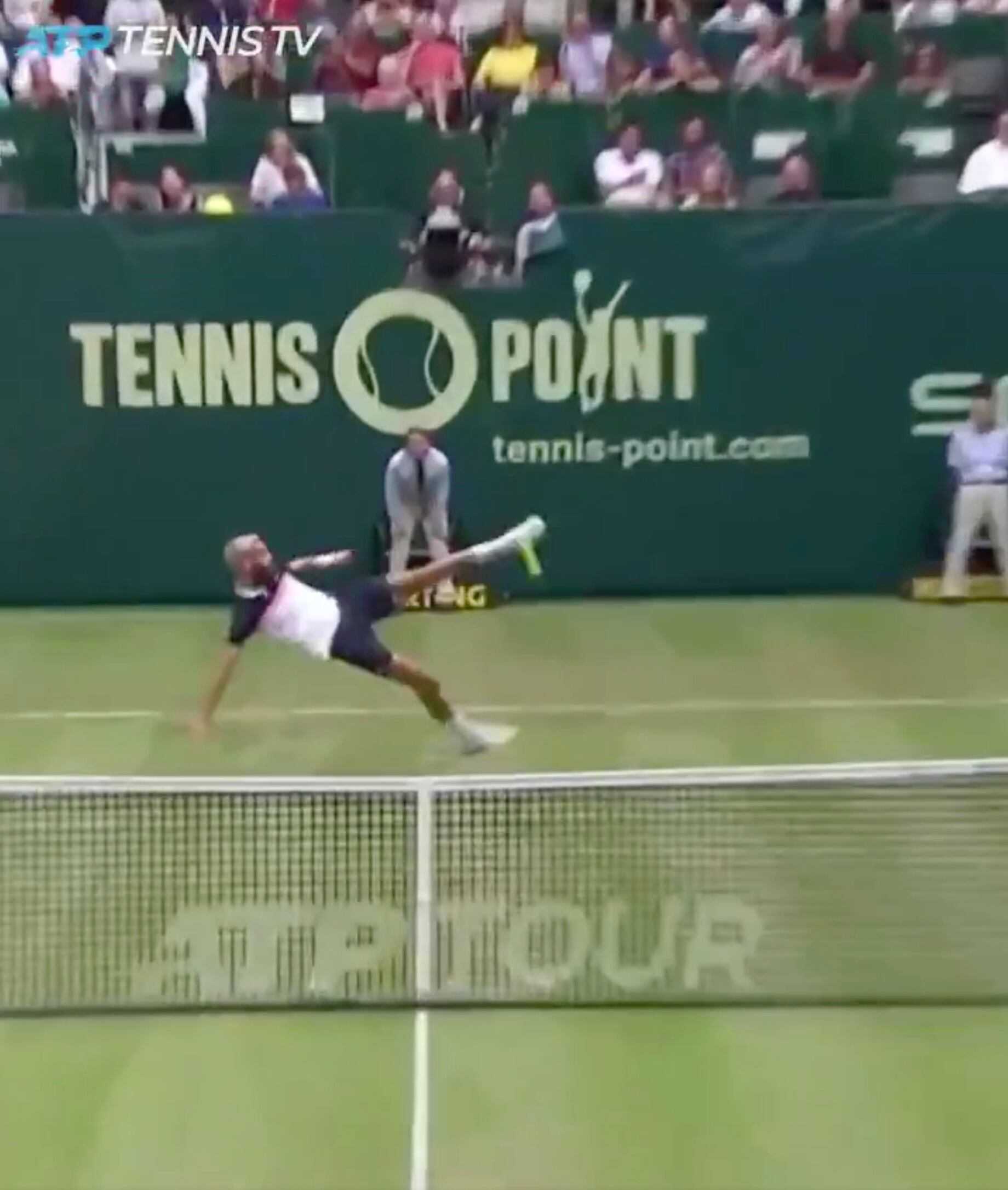 El tenista francés Benoit Paire y su compatriota Jo-Wilfred Tsonga brindaron un momento divertido a la afición presente en el torneo de Halle al ponerse a jugar futbol-tenis después de que el primero perdiera su raqueta en pleno partido.