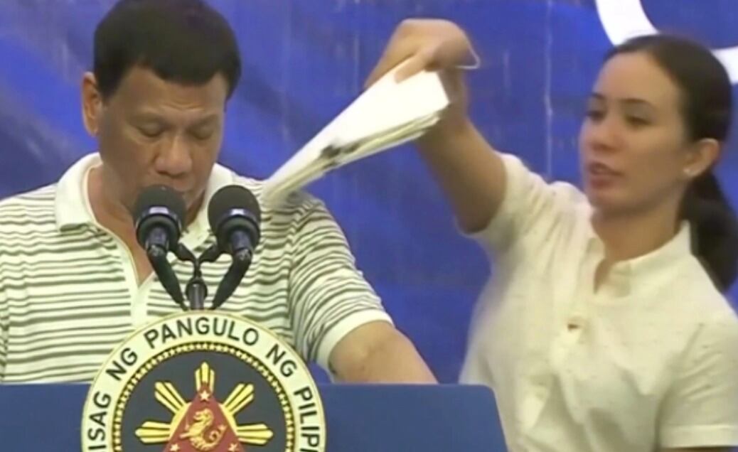 El presidente filipino, Rodrigo Duterte, y su ayudante pasaron un desagradable momento cuando una cucaracha caminó por la camisa del mandatario e interrumpió su discurso en una transmisión televisiva en vivo.