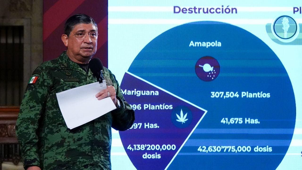 Sobre las acciones de las Fuerzas Armadas para erradicar los plantíos o producción de drogas, destacó que se han destruido diversas hectáreas de plantaciones, el equivalente a siete mil 736 veces la superficie del Estadio Azteca.