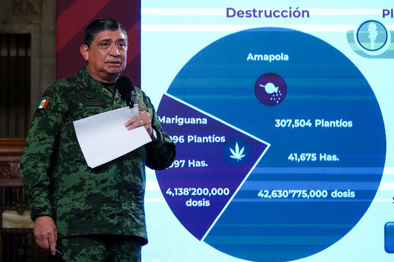 Sobre las acciones de las Fuerzas Armadas para erradicar los plantíos o producción de drogas, destacó que se han destruido diversas hectáreas de plantaciones, el equivalente a siete mil 736 veces la superficie del Estadio Azteca.
