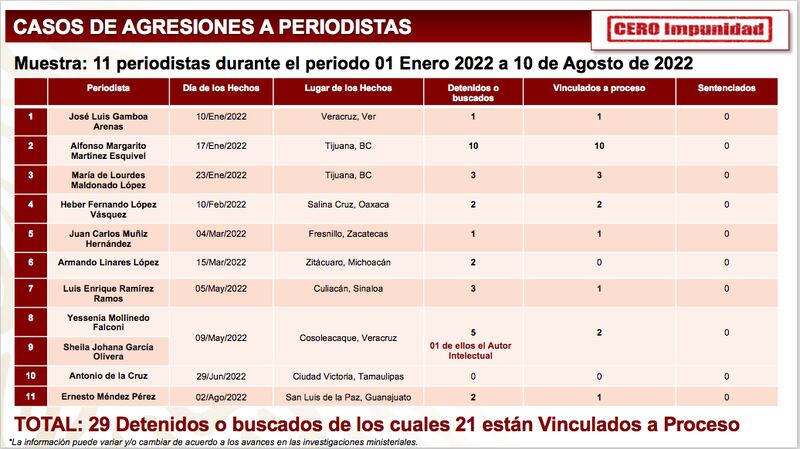 Hasta la mañana del pasado 11 de agosto, el informe Cero Impunidad, presentado como un ejercicio de transparencia por el subsecretario de Seguridad y Protección Ciudadana, Ricardo Mejía, sólo consideraba 11 asesinatos como periodistas, pues existían dos comunicadores que, además de su actividad en el medio, tenían otros oficios como fuente de ingresos.
