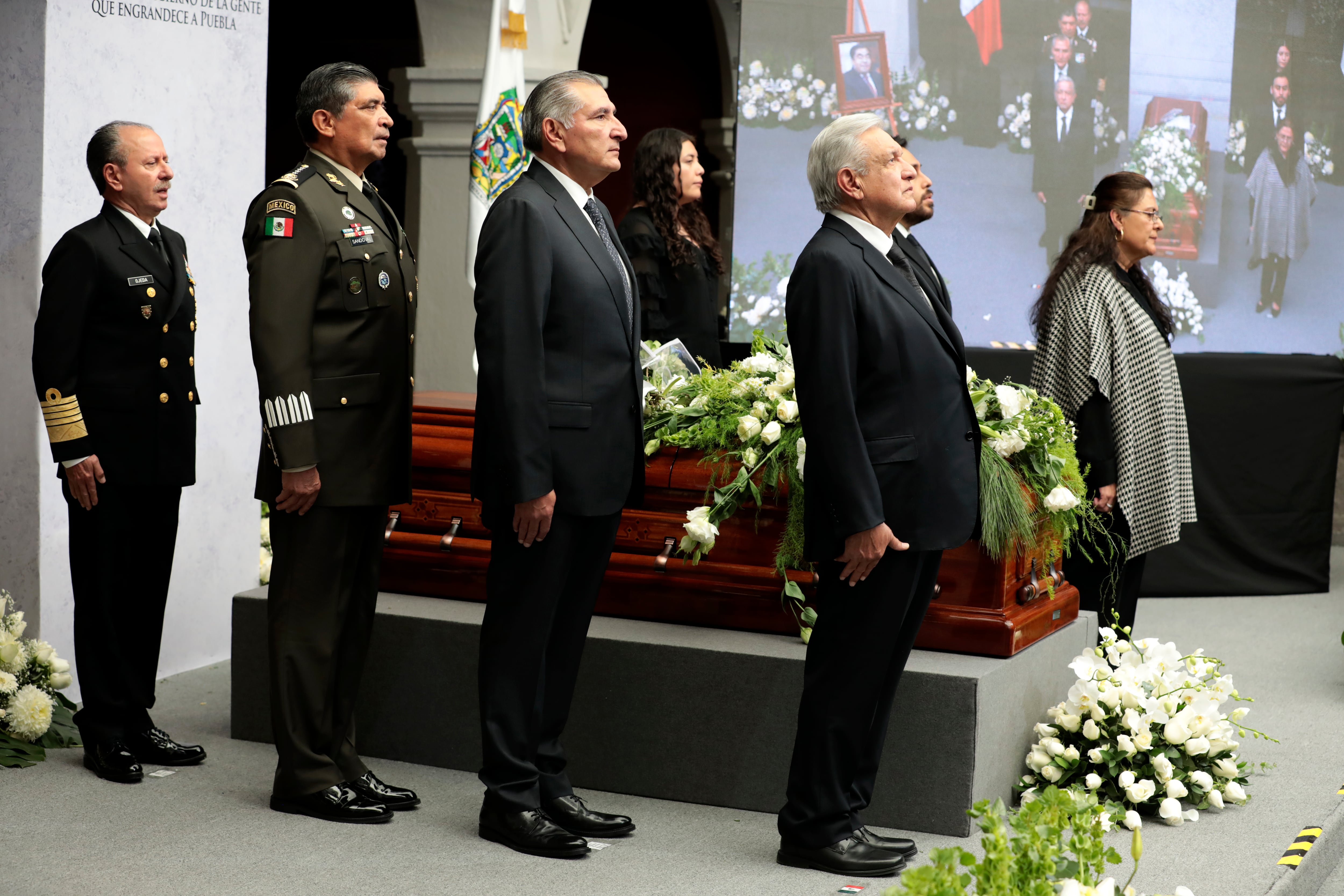 El presidente López Obrador, los secretarios de Gobernación, Adán Augusto López Hernández; de Defensa Nacional, Luis Cresencio Sandoval y de Marina, Rafael Ojeda, montaron la primera Guardia de Honor, en la que acompañó a María del Rosario Orozco Caballero, viuda del gobernador y a sus hijos.