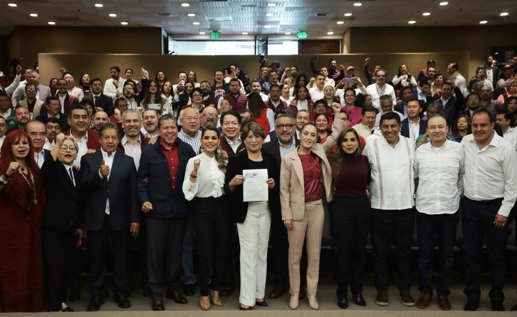 Ante el Consejo General del órgano electoral, Delfina Gómez realizó su registro como candidata a la gubernatura mexiquense por la candidatura de Morena, PT y PVEM, acompañada del dirigente nacional de Morena, Mario Delgado, y de su equipo de campaña: Horacio Duarte e Higinio Martínez, y de los líderes locales del PT, Óscar González, y del PVEM, Karen Castrejón.