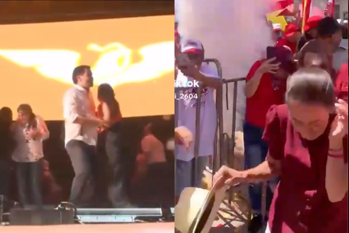 Mientras Sheinbaum caminaba hacia el escenario, la candidata que busca ser electa como presidenta de México en la jornada electoral del 2 de junio, se llevó un gran susto ya que mientras saludaba y caminaba, un explosivo detonó a escasos metros de la abanderada presidencial por Morena, PT y PVEM.