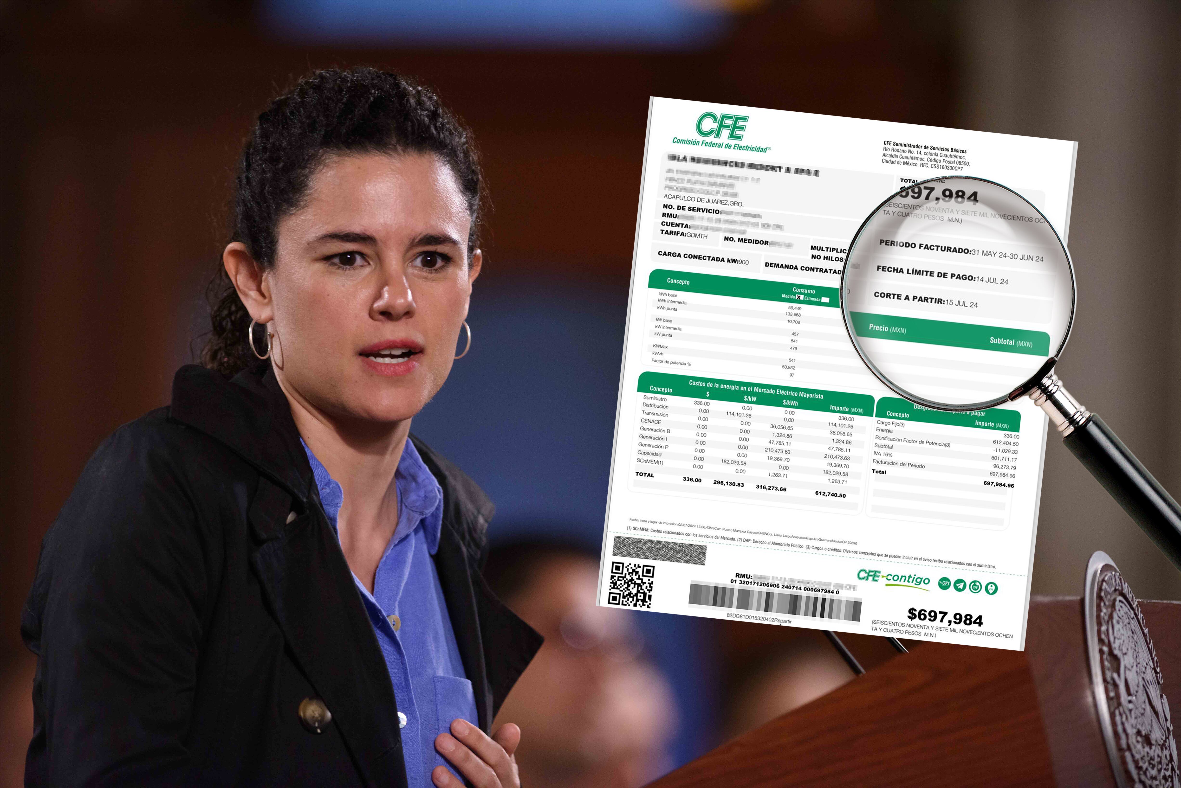 En este comprobante se logra ver el periodo facturado del 31 de mayo al 30 de junio de 2024, con una fecha límite de pago del 14 de julio, y el corte a partir de un día después de esta última, establecida por la CFE en su servicio de suministros básicos.