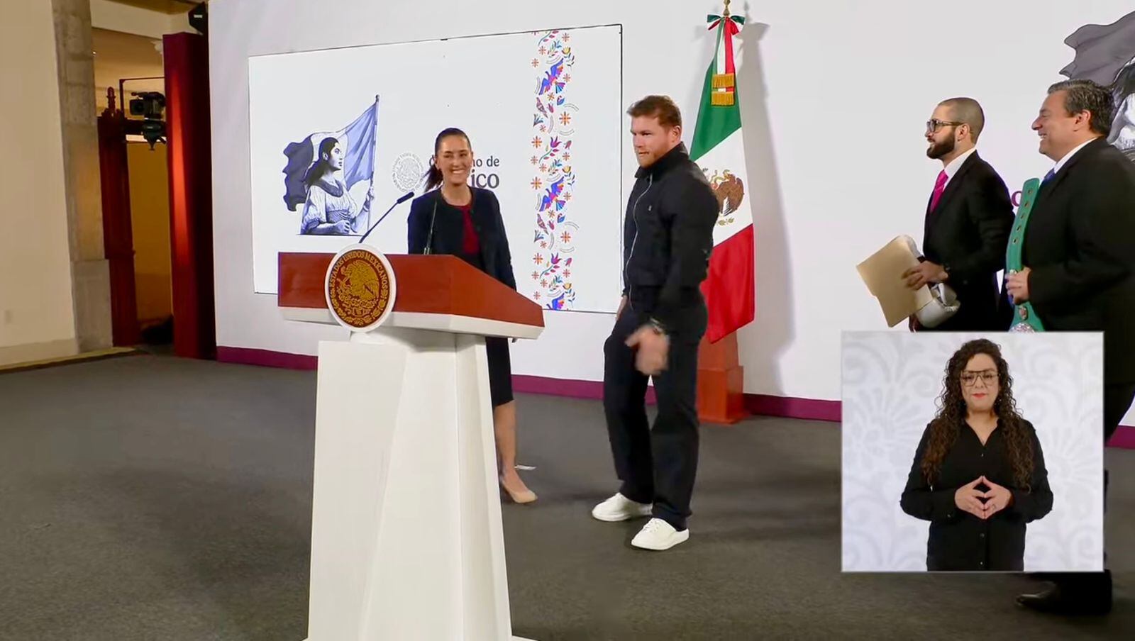 “Buenos días a todos, gusto de verlos, muchas gracias presidenta por recibirme, es un honor estar aquí con usted, gracias a todos los que están aquí, espero que pasen felices fiestas, muchas gracias por emocionarse al verme”, dijo el Canelo, quien llegó acompañado de Mauricio Sulaimán, presidente del Consejo Mundial del Boxeo (CMB).