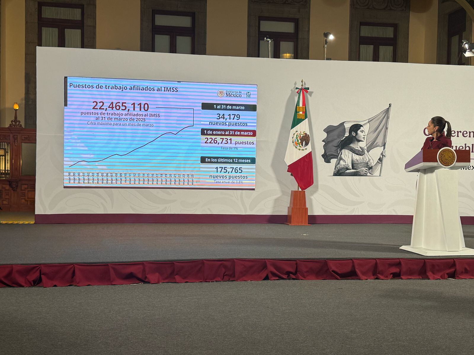 En su Mañanera del Pueblo, la presidenta informó que en este mes de marzo del 2025t se alcanzó el mayor número de puestos de trabajo afiliados al IMSS. En total, 22 millones 465 mil 110 empleos, considerando que del 1 al 31 de marzo se crearon más de 34 mil puestos, y en los últimos 12 meses más de 175 mil empleos.