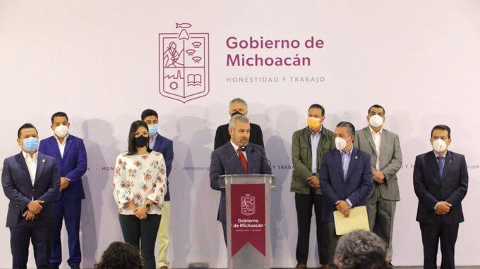 En compañía del secretario de Finanzas de Michoacán, Luis Navarro García, y otros miembros de su gabinete, el mandatario estatal explicó los pormenores presupuestales que tendrá la entidad en 2022.