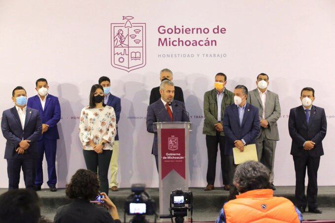 En compañía del secretario de Finanzas de Michoacán, Luis Navarro García, y otros miembros de su gabinete, el mandatario estatal explicó los pormenores presupuestales que tendrá la entidad en 2022.