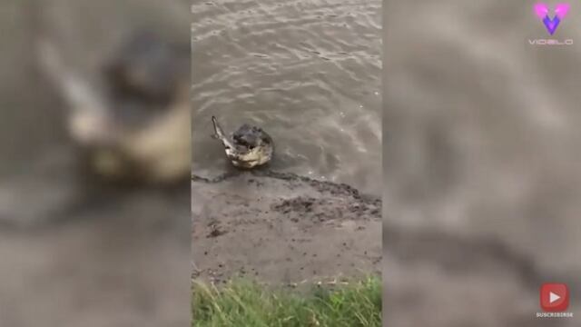 El impactante vídeo muestra al cocodrilo acercarse lentamente al tiburón, mientras este permanece inmóvil en la orilla del río. En un instante, el cocodrilo engancha al tiburón con la boca hasta tragárselo.