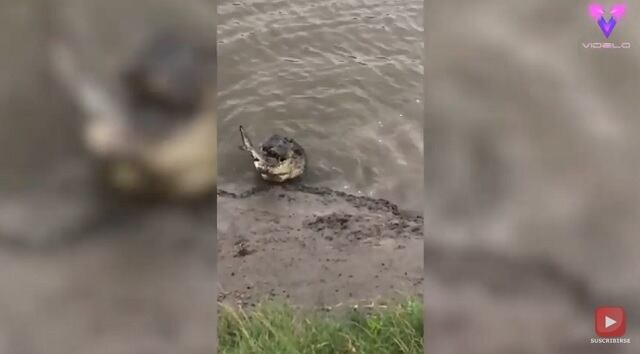 El impactante vídeo muestra al cocodrilo acercarse lentamente al tiburón, mientras este permanece inmóvil en la orilla del río. En un instante, el cocodrilo engancha al tiburón con la boca hasta tragárselo.