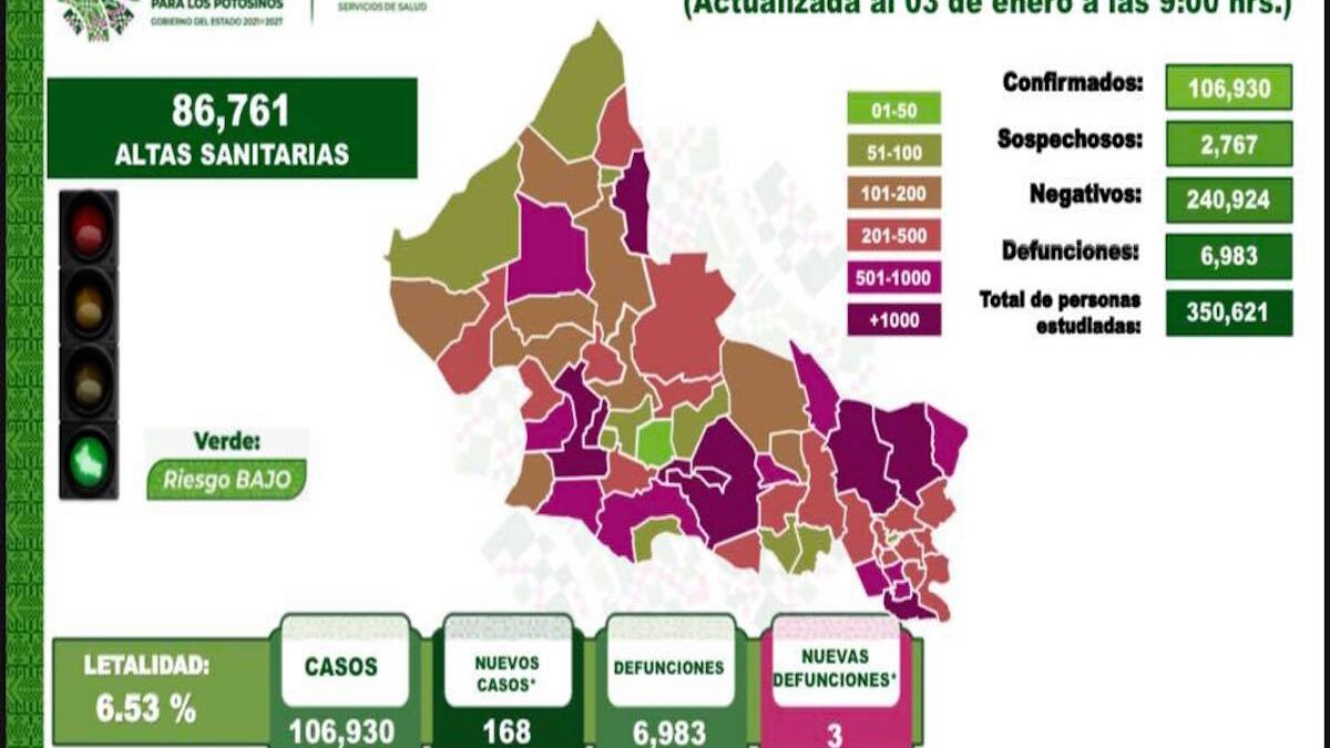 Al corte del 4 de enero se registraron en San Luis Potosí 106 mil 930 casos totales de Covid-19 desde el inicio de la pandemia a la fecha, con la confirmación de 168 nuevos contagios de acuerdo al reporte epidemiológico de las últimas 24 horas.