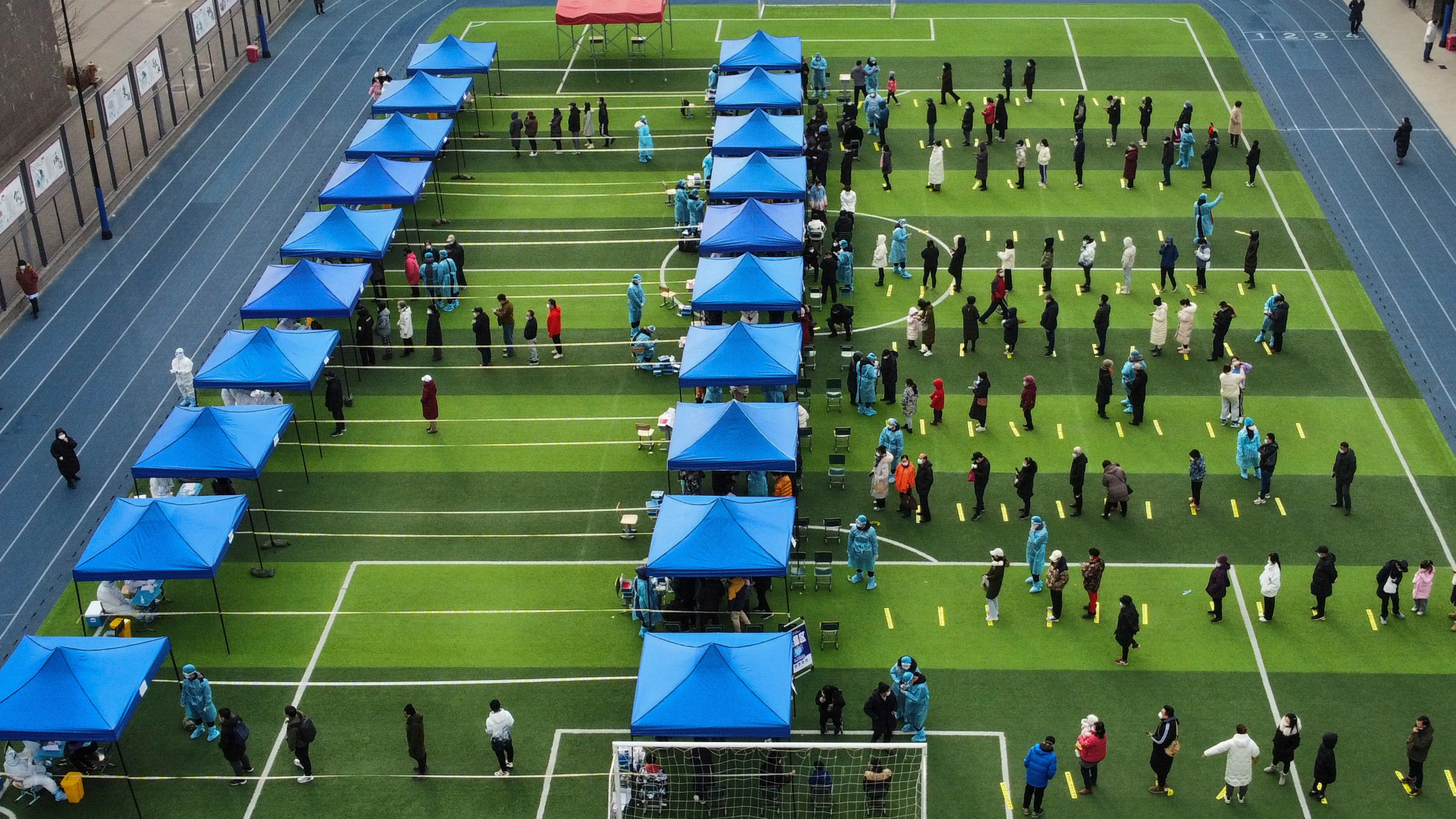 En esta imagen, distribuida por la agencia noticiosa china Xinhua, residentes hacen fila en un campo de fútbol para someterse a una prueba de detección del coronavirus durante un cribado masivo, en la municipalía de Tianjin, en el norte de China, el 9 En esta imagen, distribuida por la agencia noticiosa china Xinhua, residentes hacen fila en un campo de fútbol para someterse a una prueba de detección del coronavirus durante un cribado masivo, en la municipalía de Tianjin, en el norte de China, el 9 de enero de 2022. (Sun Fanyue/Xinhua vía AP) (Sun Fanyue/AP)
