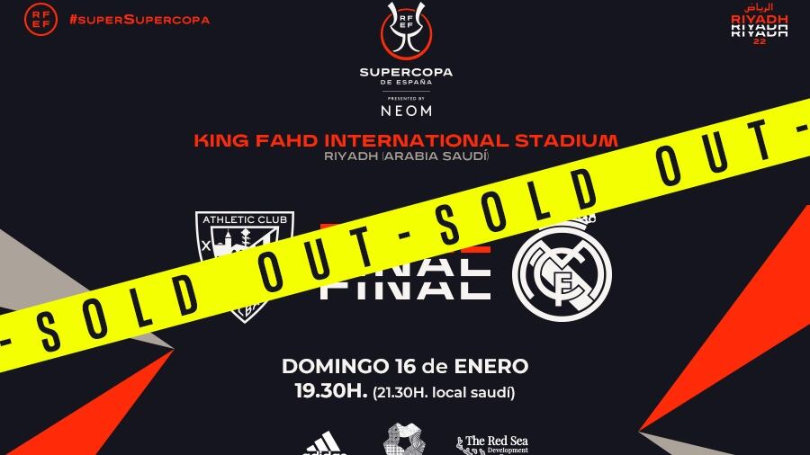 La final de la Supercopa de España, que disputarán este domingo el Athletic Club y el Real Madrid en el Estadio Internacional Rey Fahd de Riad, ha agotado las entradas disponibles en menos de una hora, ha confirmado este sábado la Real Federación Española de Fútbol (RFEF).