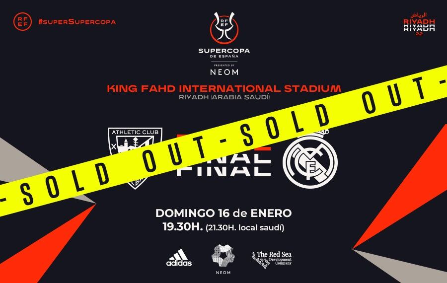 La final de la Supercopa de España, que disputarán este domingo el Athletic Club y el Real Madrid en el Estadio Internacional Rey Fahd de Riad, ha agotado las entradas disponibles en menos de una hora, ha confirmado este sábado la Real Federación Española de Fútbol (RFEF).
