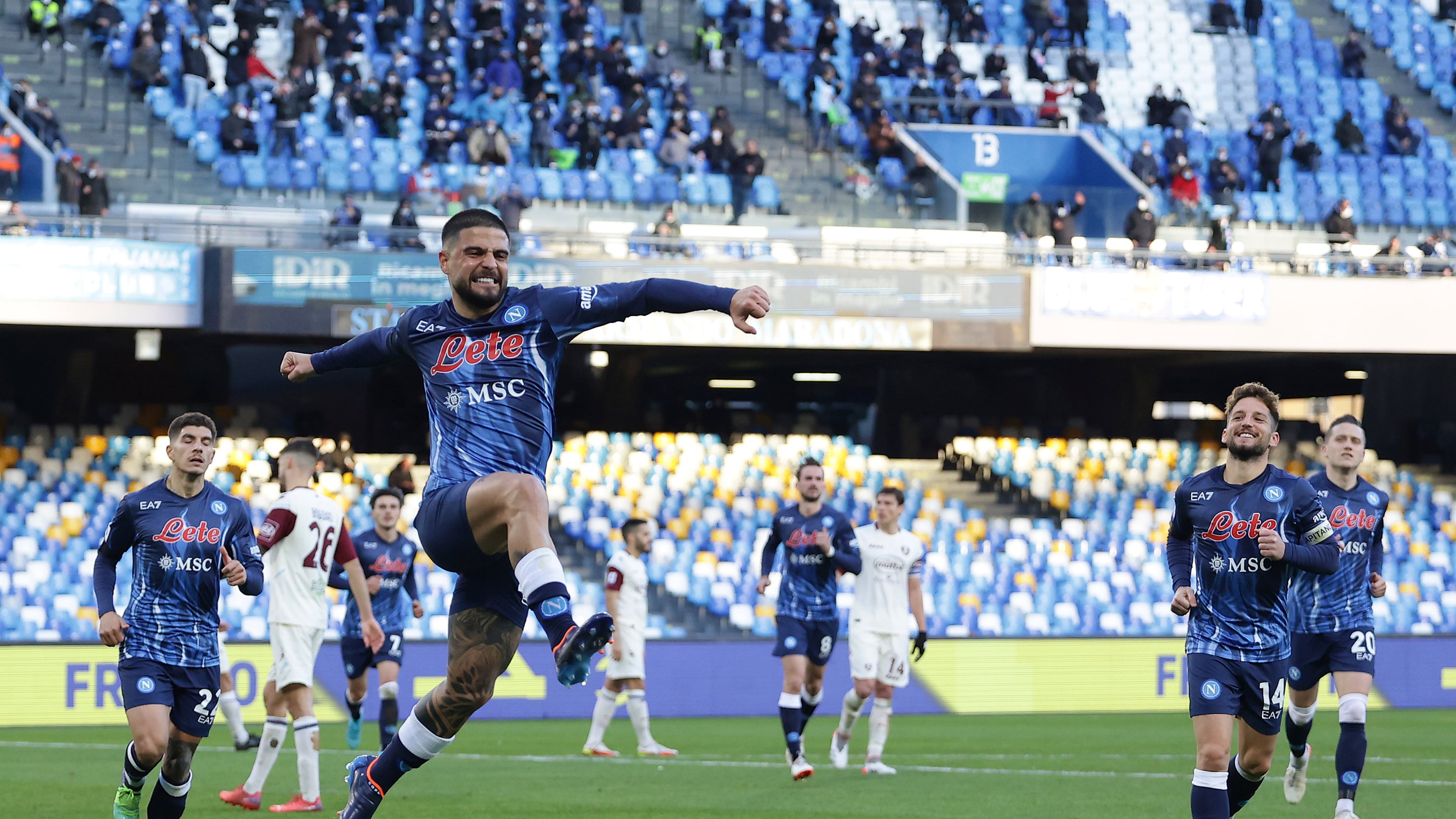 El defensa del Salerinitana fue expulsado por la segunda amarilla e Insigne convirtió el penal para empatar a Diego Maradonna con 115 goles con el club.