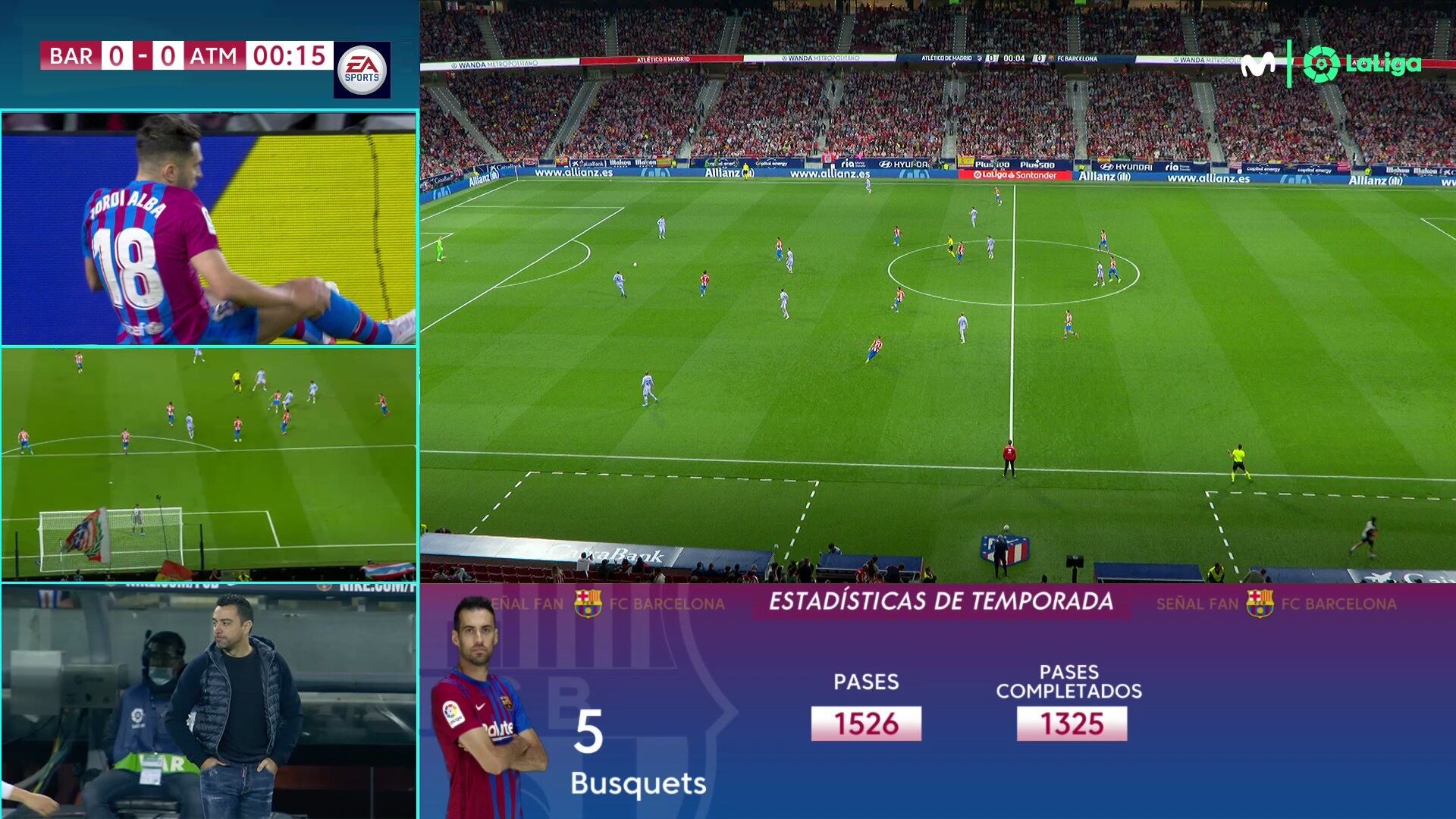 Desde esta temporada LaLiga y Movistar+ están ofreciendo una nueva señal multicámara en sus retransmisiones, formada por cuatro ventanas en una única pantalla partida, además de un módulo de estadísticas en tiempo real, extraídas del sistema de análisis de datos de juego Mediacoach.