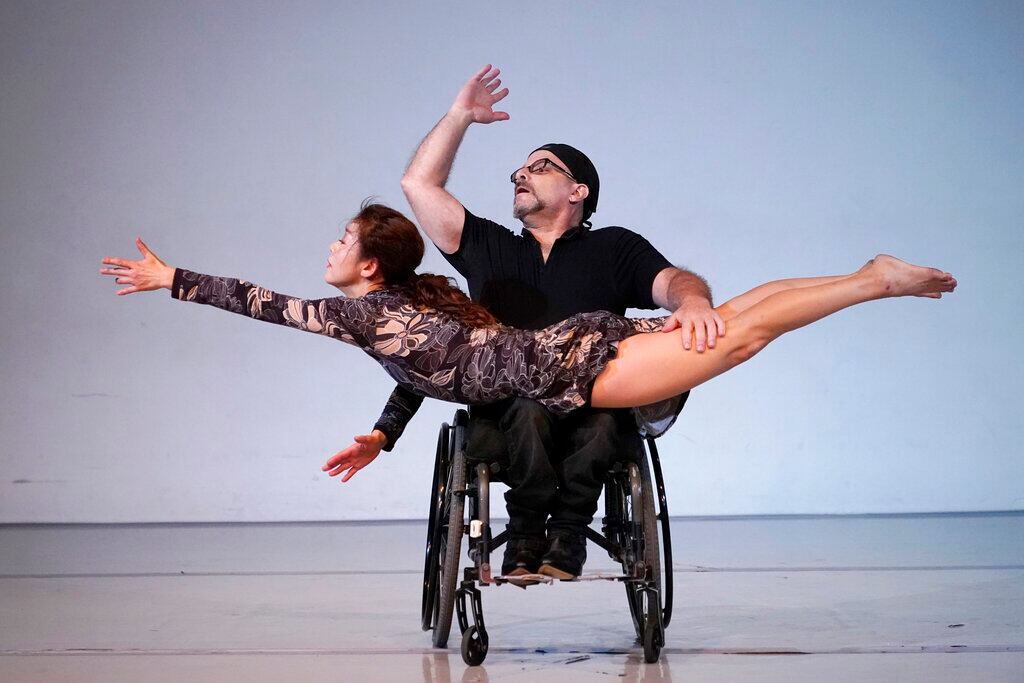 FLORIDA, ESTADOS UNIDOS Sun Young Park, al frente, y Adam Eckstat, ensayan con la compañía de danza Karen Peterson y Dancers, para una producción titulada SAMSARA, en Miami. La producción explora los temas de la discapacidad, la dinámica familiar y el linaje generacional. (Lynne Sladky/AP)