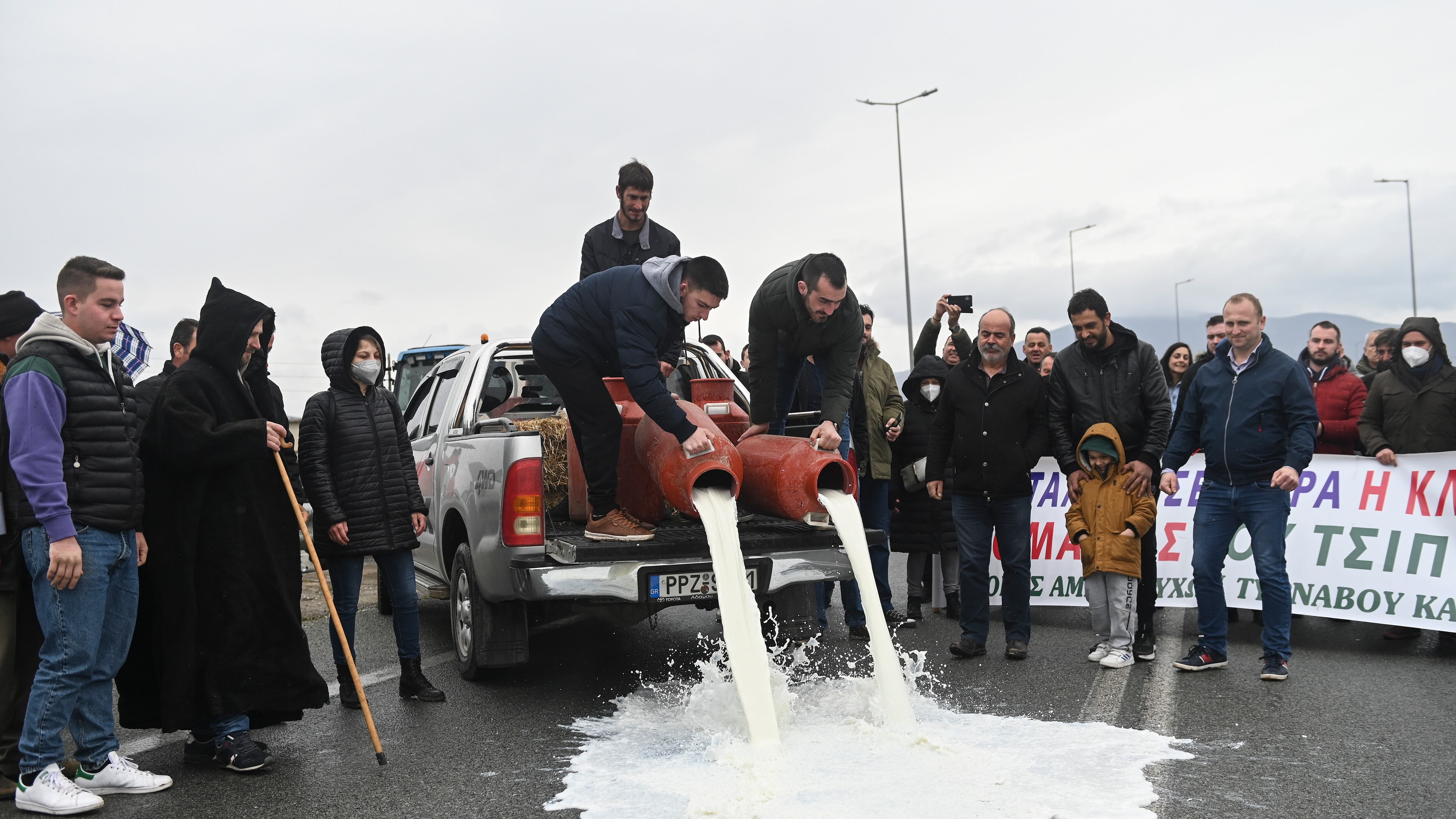 Los agricultores griegos ya llevan unos 10 días trancando la vía entre Larissa y la ciudad de Kozani, al noroeste. El domingo, vertieron leche sobre la calle como parte de su protesta.