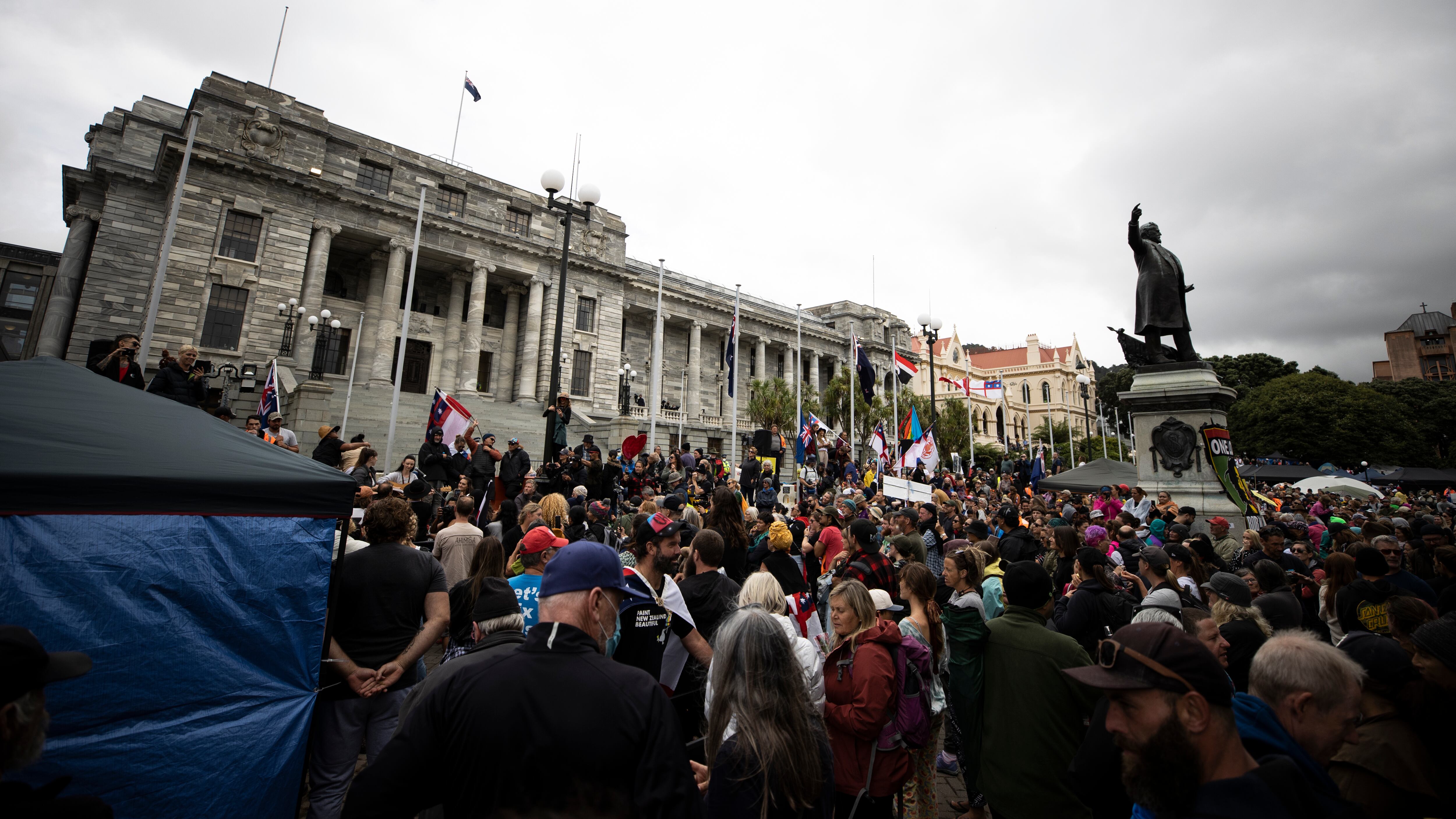 En un principio, la policía permitió que los manifestantes levantaran carpas y acamparan en los terrenos del parlamento neozelandés, antes de detener a 122 personas y volver a retirarse. El tamaño de la protesta se redujo a unos pocos cientos de personas la semana pasada, pero volvió a crecer a unas 3.000 durante el fin de semana.