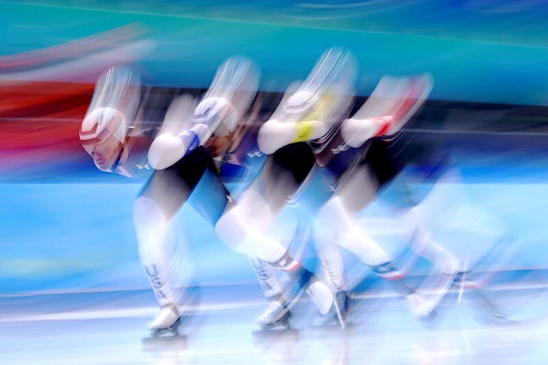 BEIJING, CHINA Kamila Valieva, del Comité Olímpico Ruso, compite en el programa corto femenino durante el patinaje artístico de los Juegos Olímpicos de Invierno de 2022, en Beijing. (David J. Phillip/AP) BEIJING, CHINA El equipo de Estados Unidos con Casey Dawson, Emery Lehman y Joey Mantia patinan durante la Final B de persecución por equipos masculinos en el día once de los Juegos Olímpicos de Invierno de Beijing 2022 en el National Speed Skating Oval en Beijing, China. (Dean Mouhtaropoulos/Getty Images)