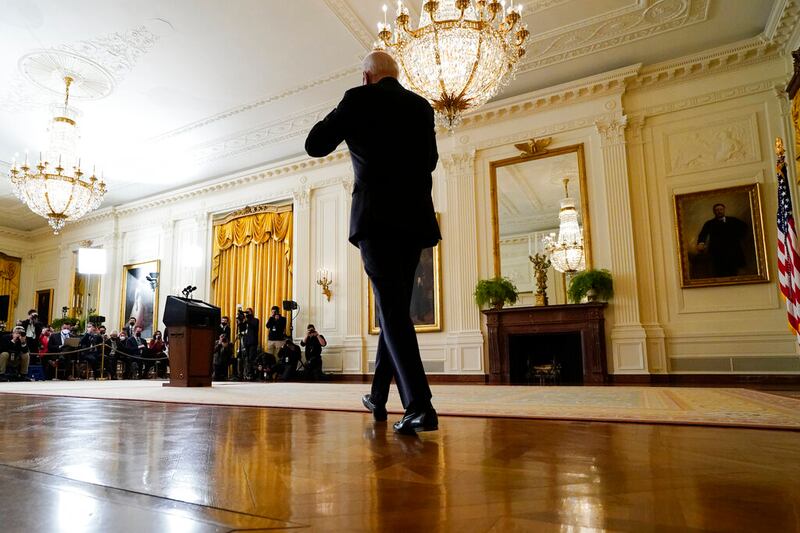 WASHINGTON, ESTADOS UNIDOS El presidente Joe Biden llega para hablar sobre Ucrania en el Salón Este de la Casa Blanca, en Washington. (Alex Brandon/AP)