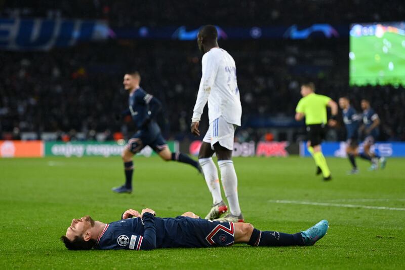 PARÍS, FRANCIA Lionel Messi de Paris Saint-Germain reacciona durante un partido de la Liga de Campeones de la UEFA entre el PSG y Real Madrid en el Parc des Princes en París, Francia. (Shaun Botterill/Getty Images)