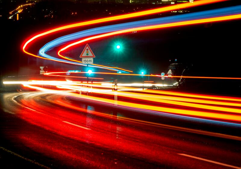 FRANKFURT, ALEMANIA Esta fotografía fue capturada con el obturador lento de una cámara para marcar luces de los automóviles que pasan en dirección a Frankfurt, Alemania. (Michael Probst/AP)