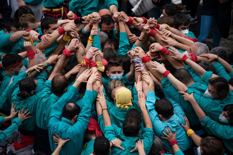 BARCELONA, ESPAÑA Participantes se unen para construir la base de una torre humana en la “diada CastellerA” durante las celebraciones de Santa Eulalia en Barcelona, España. Después de dos años de celebraciones canceladas o silenciadas debido a la pandemia, esta Ciudad mediterránea hizo todo lo posible para celebrar la fiesta de su patrón. (Joan Mateu Parra/AP)