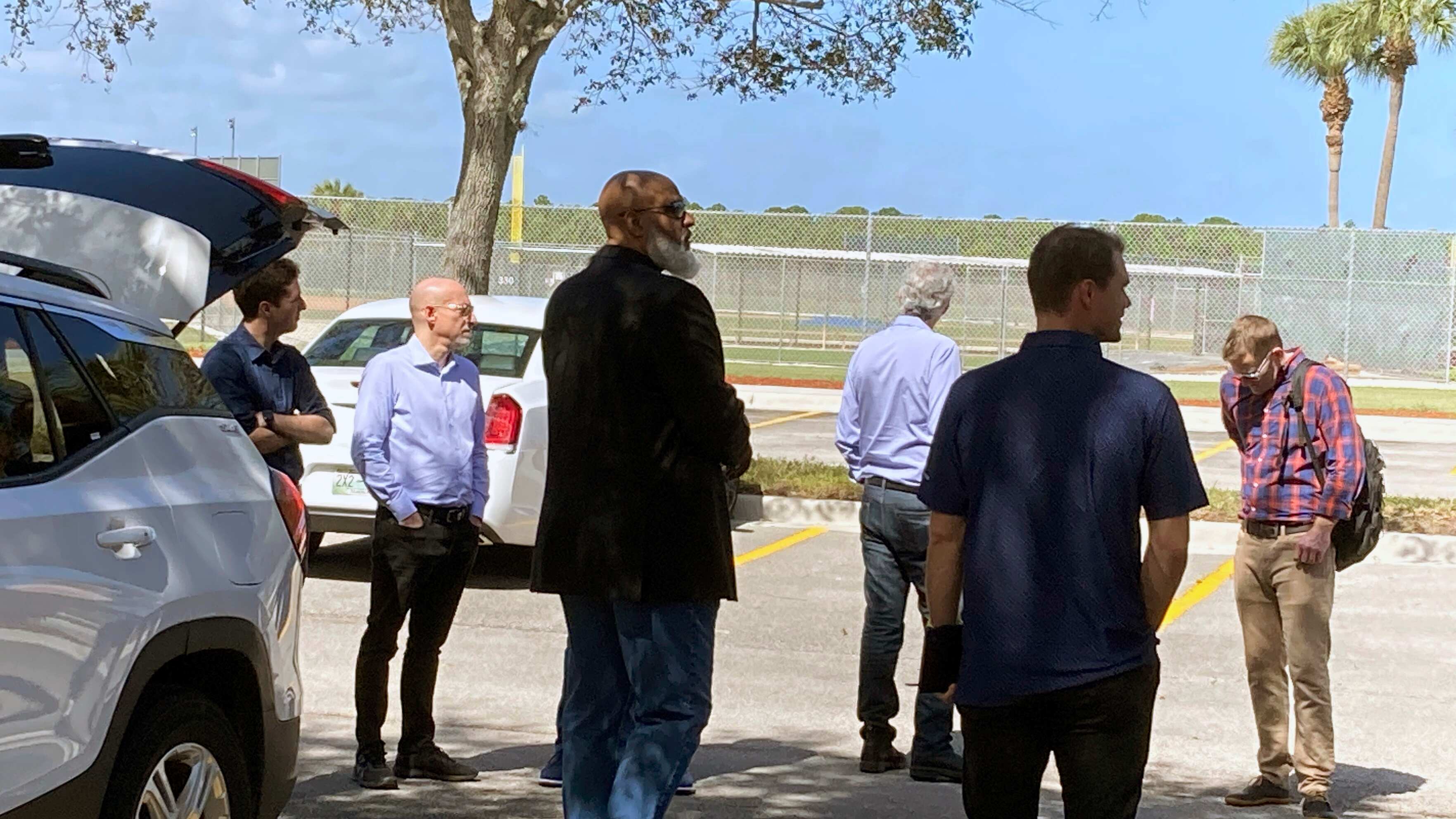 Clark y los jugadores se reunieron con Bruce Meyer, el jefe negociador del sindicato en el estacionamiento del lado del jardín derecho antes de ingresar al parque.