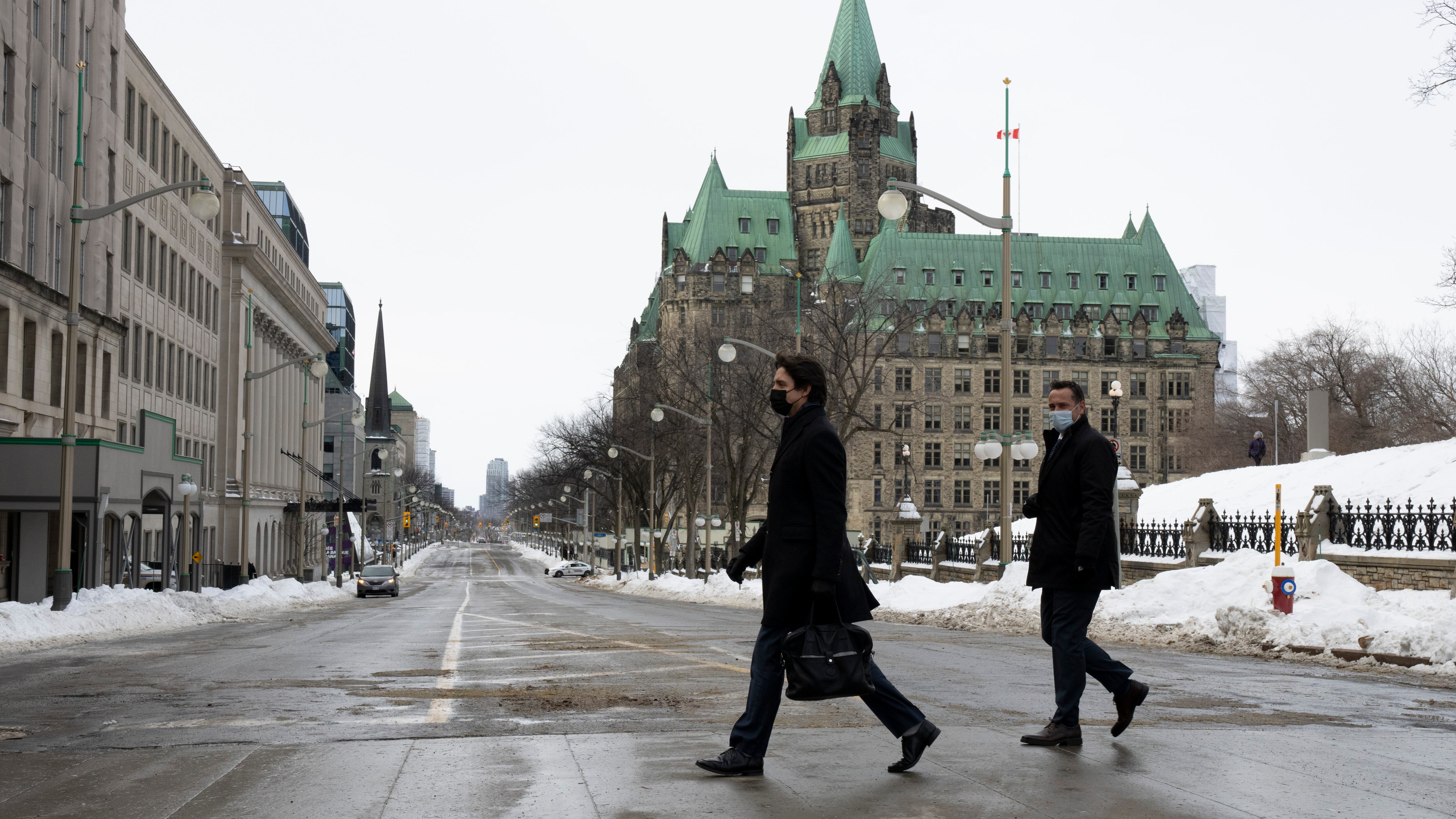 El primer ministro de Canadá Justin Trudeau cruza la calle Wellington hacia una conferencia de prensa en Ottawa el 21 de febrero del 2022. (Adrian Wyld/The Canadian Press viçía AP) El primer ministro de Canadá Justin Trudeau cruza la calle Wellington hacia una conferencia de prensa en Ottawa el 21 de febrero del 2022. (Adrian Wyld/The Canadian Press viçía AP) (Adrian Wyld/AP)