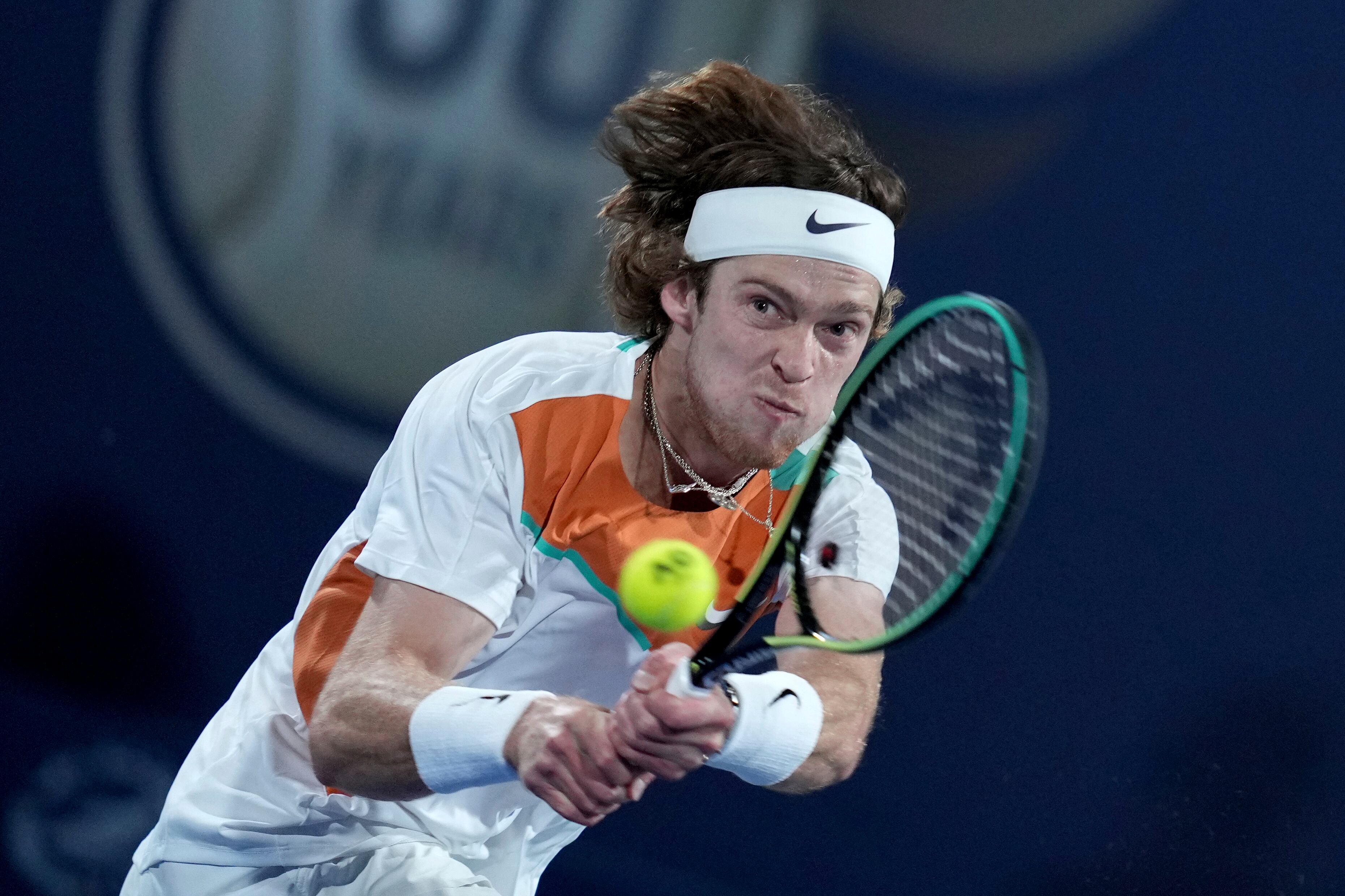 El ruso Andrey Rublev regresa la bola en el duelo de primera ronda del Campeonato de Dubai ante el británico Daniel Evans el martes 22 de febrero del 2022.(AP Foto/Ebrahim Noroozi) El ruso Andrey Rublev regresa la bola en el duelo de primera ronda del Campeonato de Dubai ante el británico Daniel Evans el martes 22 de febrero del 2022.(AP Foto/Ebrahim Noroozi) (Ebrahim Noroozi/AP)