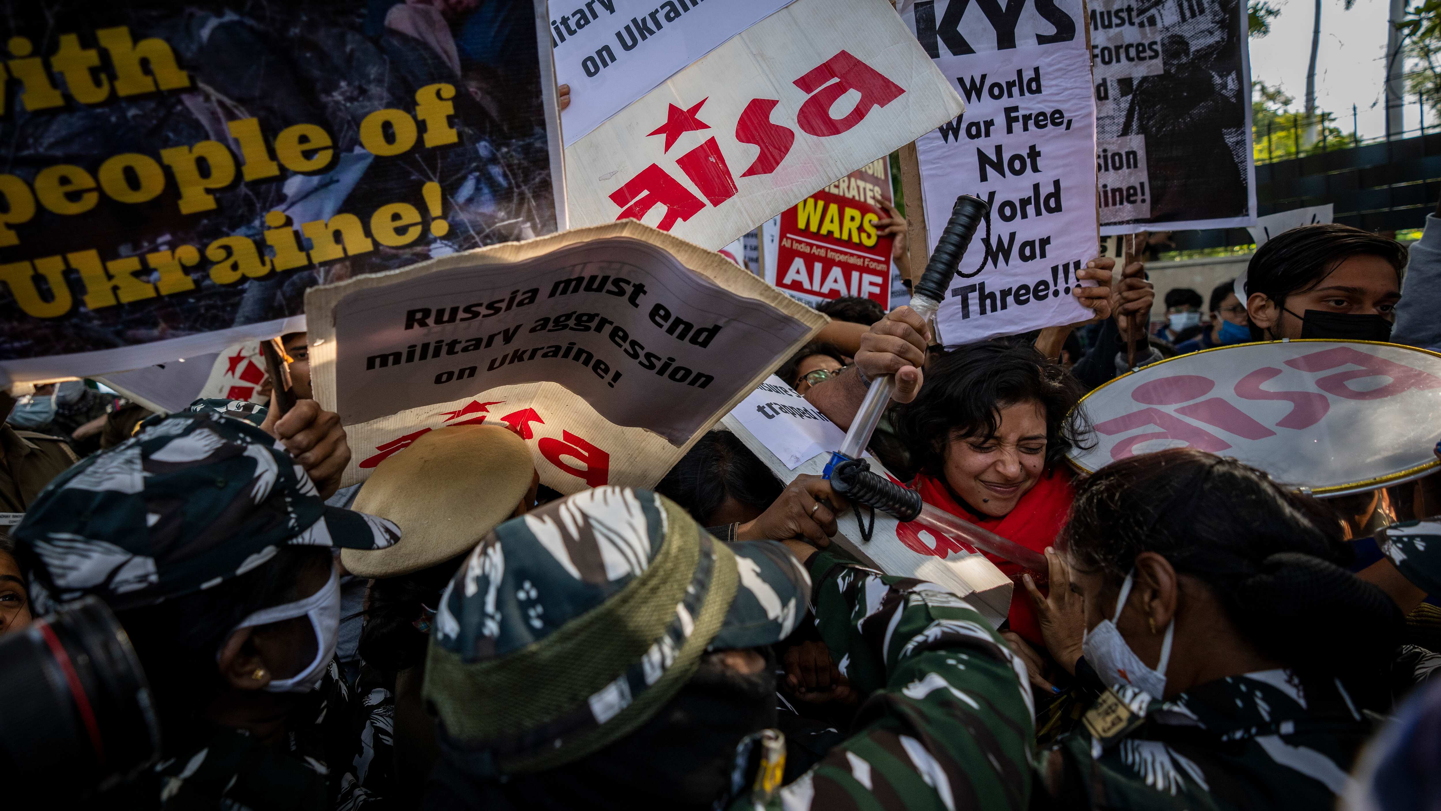 Al continuar los combates en Ucrania, varias organizaciones marcharon el sábado en la capital india para exigir el cese de la agresión rusa y presionar al gobierno indio para que evacúe a miles de indios, en su mayoría estudiantes, que están varados allí.
