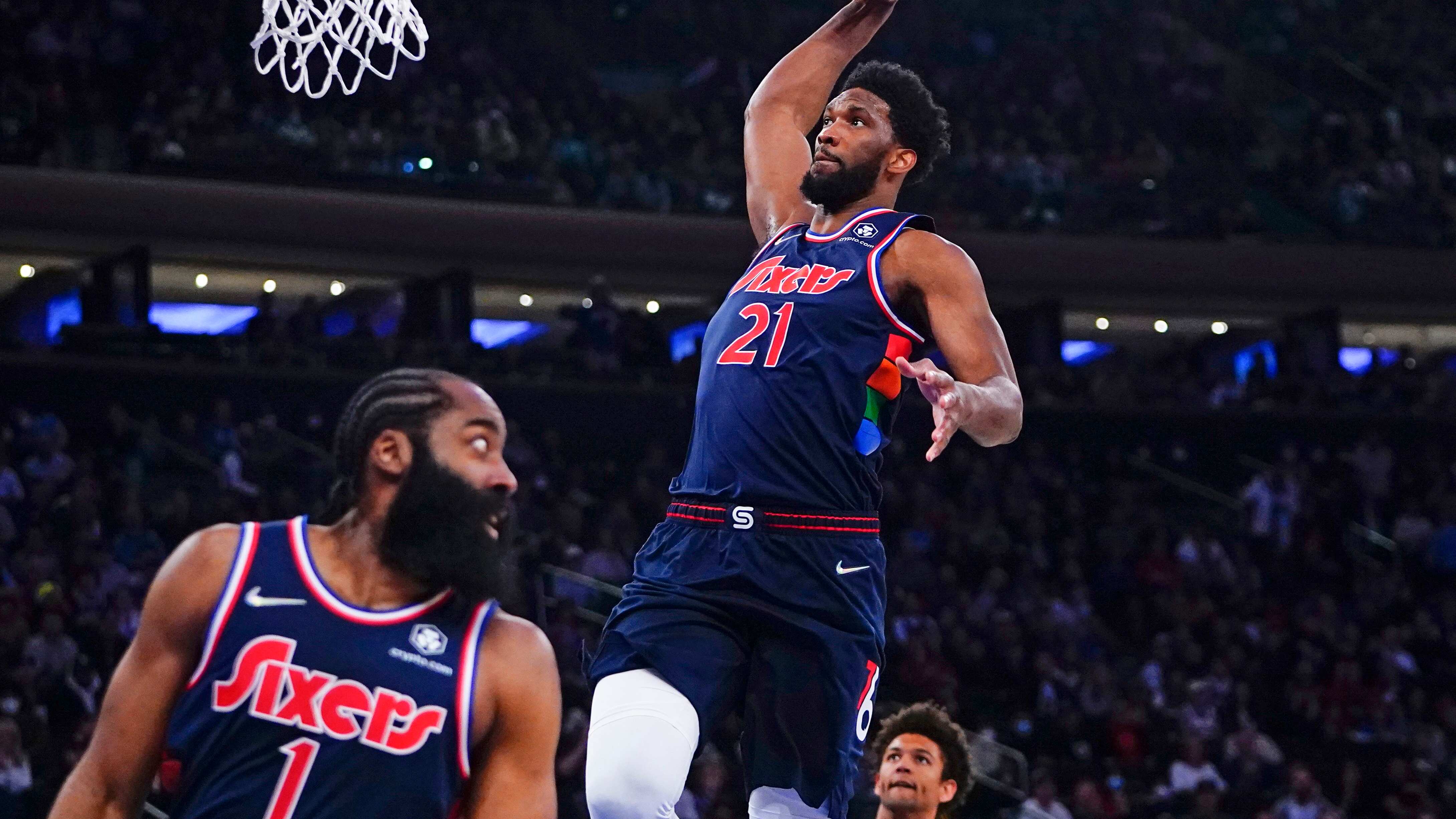 NUEVA YORK (AP) — Joel Embiid anotó 37 puntos y estableció el mejor registro de su carrera y una marca en la temporada de la NBA al atinar 23 tiros libres, James Harden aportó 29 unidades, 16 asistencias y 10 rebotes para que los 76ers de Filadelfia hilvanaran triunfos con su nuevo dúo de estrellas al derrotar 125-109 al domingo a los Knicks de Nueva York.