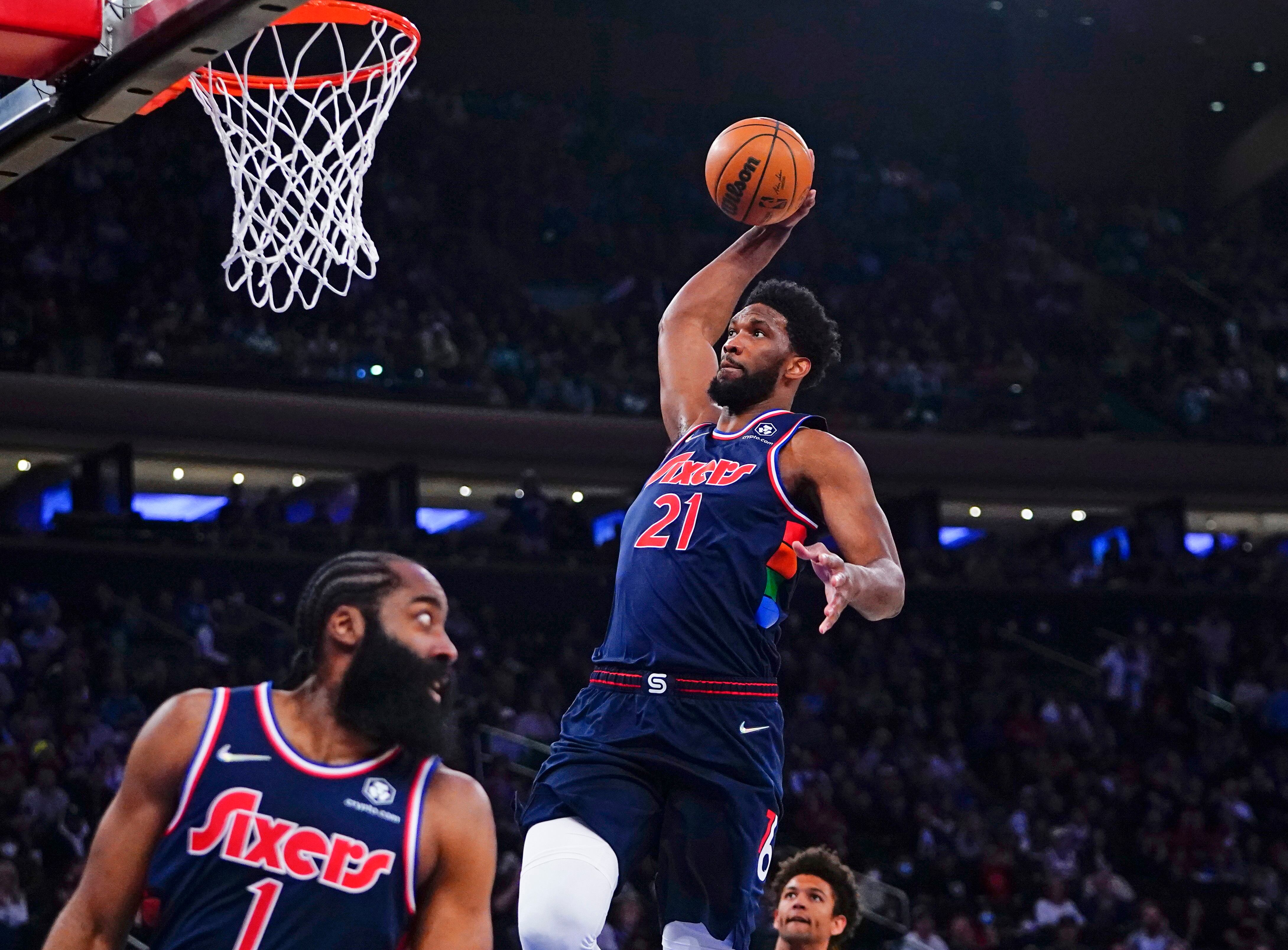 NUEVA YORK (AP) — Joel Embiid anotó 37 puntos y estableció el mejor registro de su carrera y una marca en la temporada de la NBA al atinar 23 tiros libres, James Harden aportó 29 unidades, 16 asistencias y 10 rebotes para que los 76ers de Filadelfia hilvanaran triunfos con su nuevo dúo de estrellas al derrotar 125-109 al domingo a los Knicks de Nueva York.