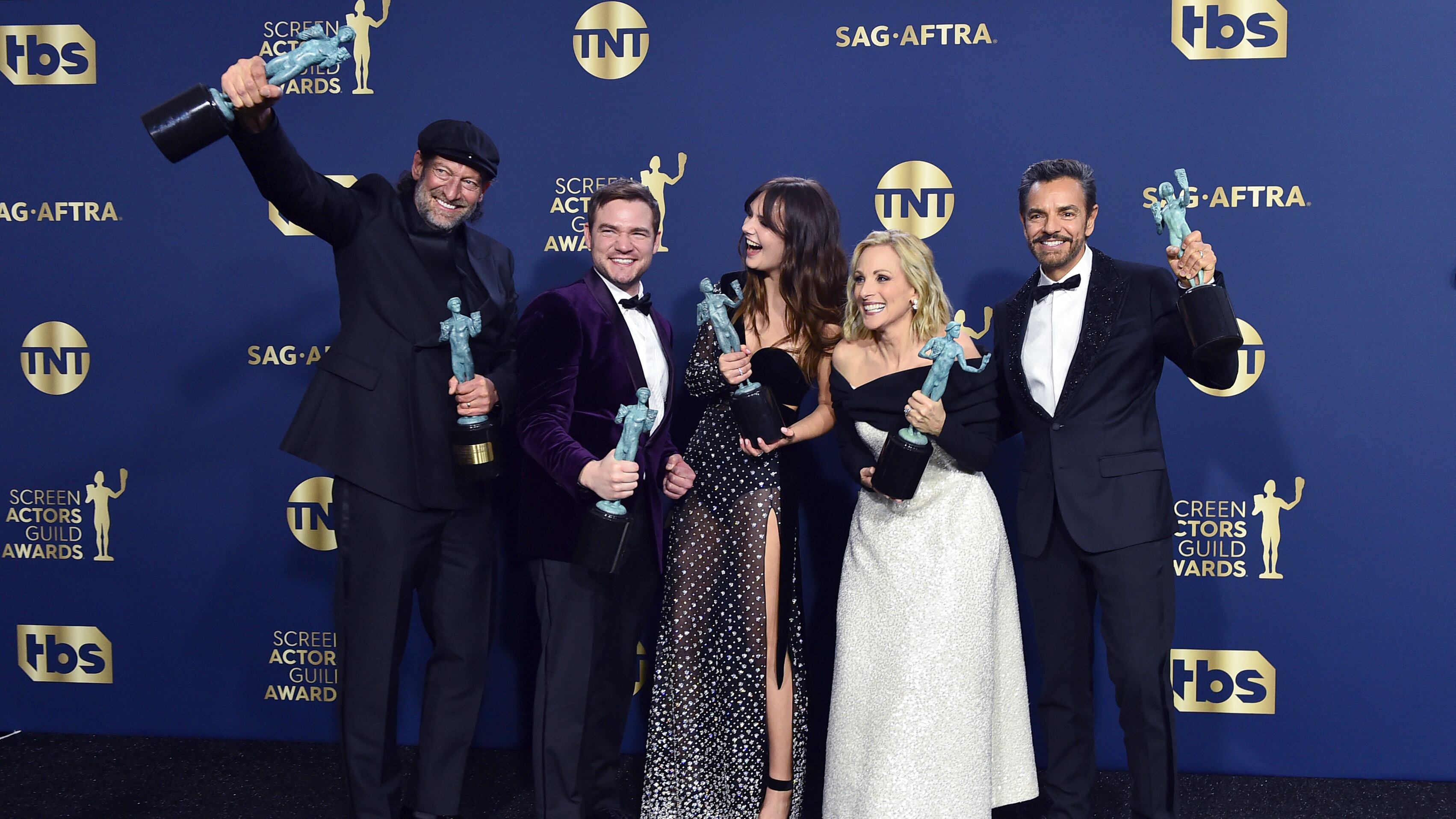 Troy Kotsur, ganador del Premio SAG al mejor actor de reparto, y sus compañeros de "CODA" Daniel Durant, Emilia Jones, Marlee Matlin y Eugenio Derbez, de izquierda a derecha, posan tras ganar el máximo premio de la noche, al mejor elenco, el domingo 27 Troy Kotsur, ganador del Premio SAG al mejor actor de reparto, y sus compañeros de «CODA» Daniel Durant, Emilia Jones, Marlee Matlin y Eugenio Derbez, de izquierda a derecha, posan tras ganar el máximo premio de la noche, al mejor elenco, el domingo 27 de febrero de 2022 en Santa Mónica, California. (Foto por Jordan […] (Jordan Strauss/Jordan Strauss/Invision/AP)
