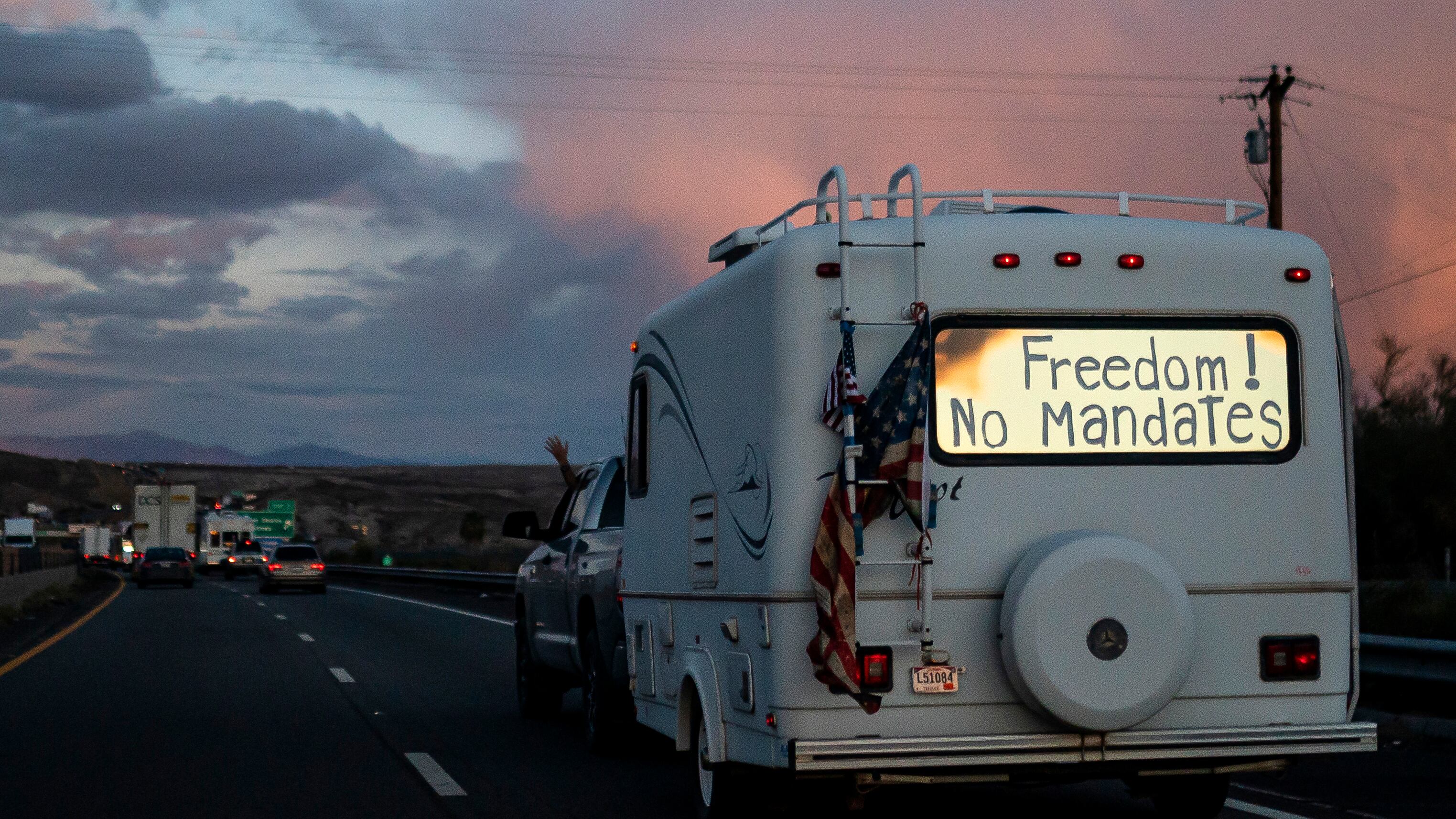 ARCHIVO - Una camioneta con la frase "¡Libertad! ¡No mandatos" en su ventana trasera viaja como parte de una caravana rumbo a Washington D.C. para protestar contra los mandatos por el COVID-19, el 23 de febrero de 2022, cerca de Needles, California. (AP ARCHIVO – Una camioneta con la frase «¡Libertad! ¡No mandatos» en su ventana trasera viaja como parte de una caravana rumbo a Washington D.C. para protestar contra los mandatos por el COVID-19, el 23 de febrero de 2022, cerca de Needles, California. (AP Foto/Nathan Howard, archivo) (Nathan Howard/AP)