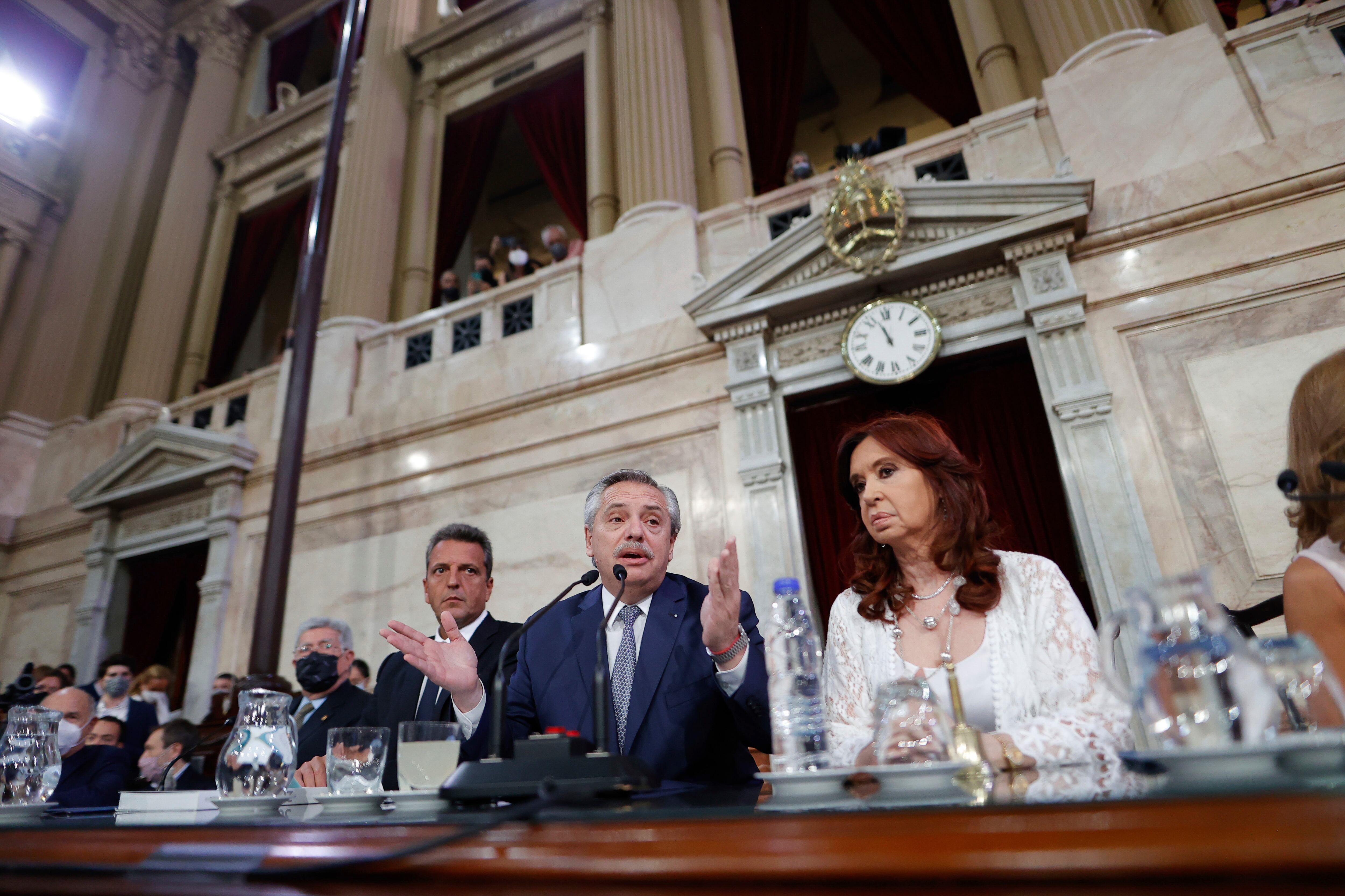 El presidente Alberto Fernández se dirige a la nación en el Congreso, junto con la vicepresidenta Cristina Fernández, durante la sesión de apertura de las sesiones ordinarias del Parlamento en Buenos Aires, Argentina, el martes 1 de marzo de 2022. (Ju El presidente Alberto Fernández se dirige a la nación en el Congreso, junto con la vicepresidenta Cristina Fernández, durante la sesión de apertura de las sesiones ordinarias del Parlamento en Buenos Aires, Argentina, el martes 1 de marzo de 2022. (Juan Ignacio Roncoroni, Pool foto vía AP) (Juan Ignacio RONCORONI/AP)