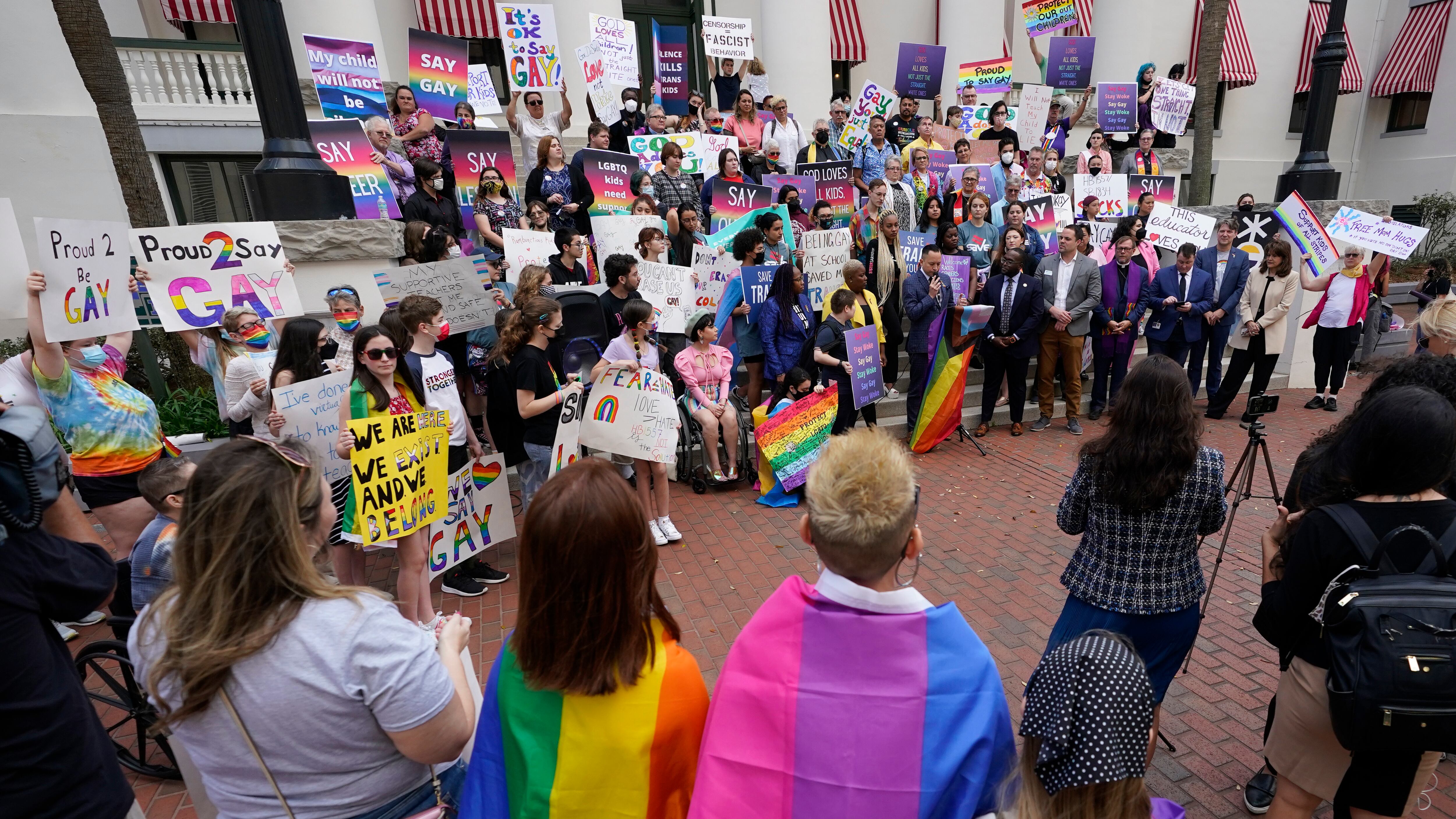 Jóvenes opuestos a un proyecto de ley que impide enseñar acerca de la orientación sexual y la identidad de género desde el jardín de infantes hasta el tercer grado se manifiestan frente a la legislatura de la Florida en Tallahassee el 7 de marzo del Jóvenes opuestos a un proyecto de ley que impide enseñar acerca de la orientación sexual y la identidad de género desde el jardín de infantes hasta el tercer grado se manifiestan frente a la legislatura de la Florida en Tallahassee el 7 de marzo del 2022. La legislatura aprobó el proyecto al día siguiente. (AP […] (Wilfredo Lee/AP)