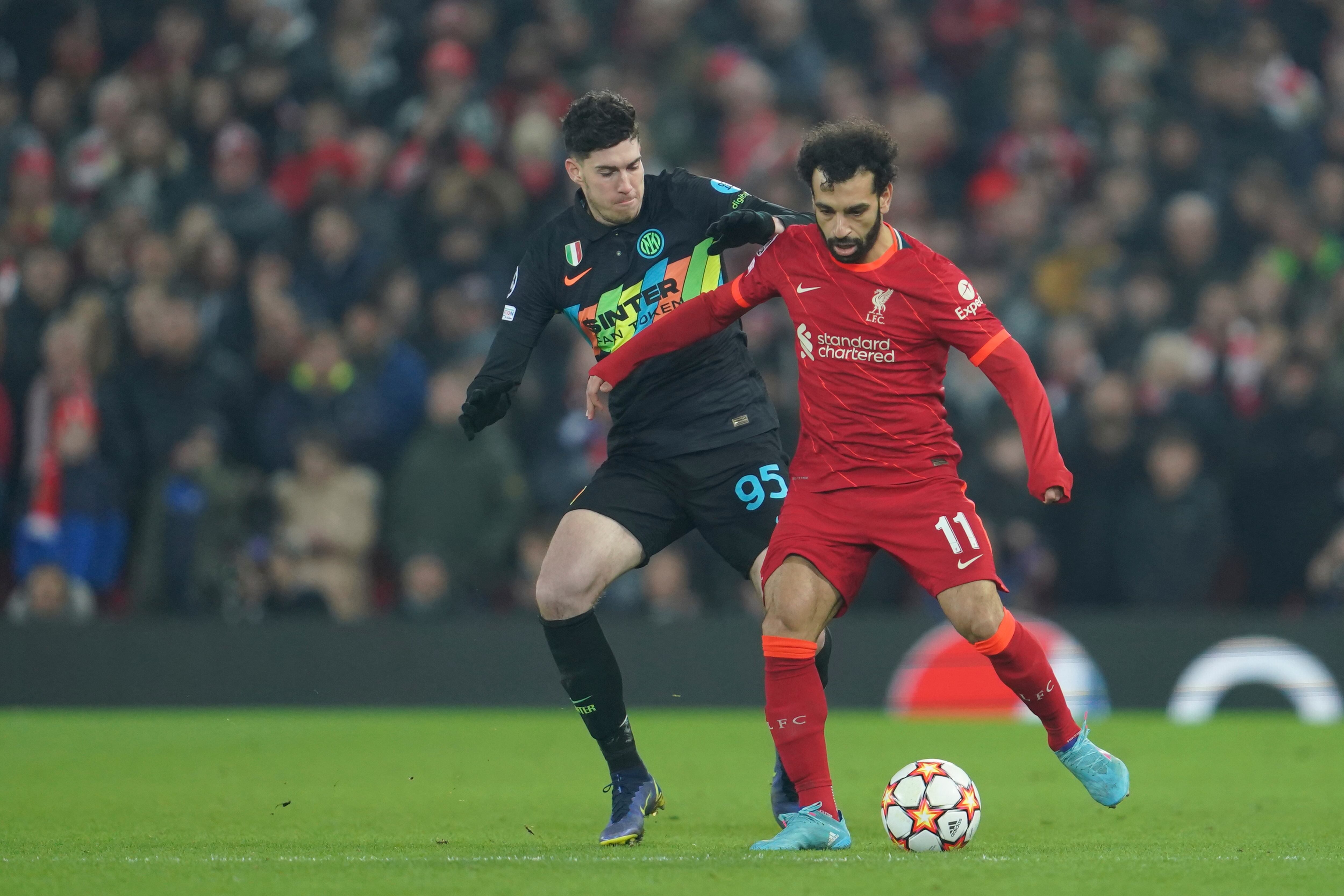 Mohamed Salah del Liverpool y Alessandro Bastoni del Inter de Milán pelean por el balón en el encuentro de vuelta de los octavos de final de la Liga de Campeones el martes 8 de marzo del 2021. (AP Foto/Jon Super) Mohamed Salah del Liverpool y Alessandro Bastoni del Inter de Milán pelean por el balón en el encuentro de vuelta de los octavos de final de la Liga de Campeones el martes 8 de marzo del 2021. (AP Foto/Jon Super) (Jon Super/AP)