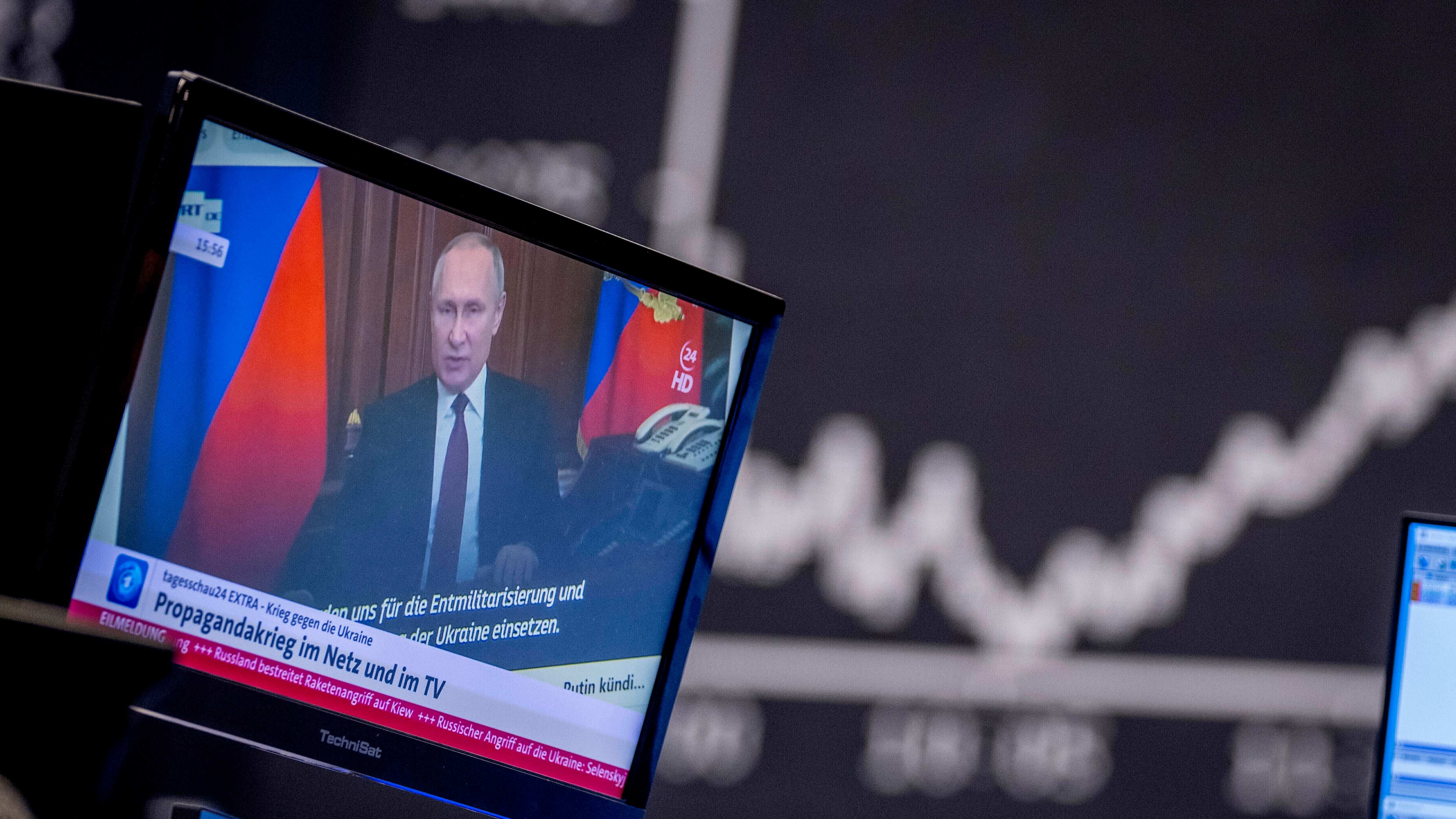 Archivo - presidente de Rusia, Vladimir Putin, aparece en una pantalla de televisión en la bolsa de valores de Fráncfort, Alemania, el viernes 25 de febrero de 2022. (AP Foto/Michael Probst, Archivo) Archivo – presidente de Rusia, Vladimir Putin, aparece en una pantalla de televisión en la bolsa de valores de Fráncfort, Alemania, el viernes 25 de febrero de 2022. (AP Foto/Michael Probst, Archivo) (Michael Probst/AP)
