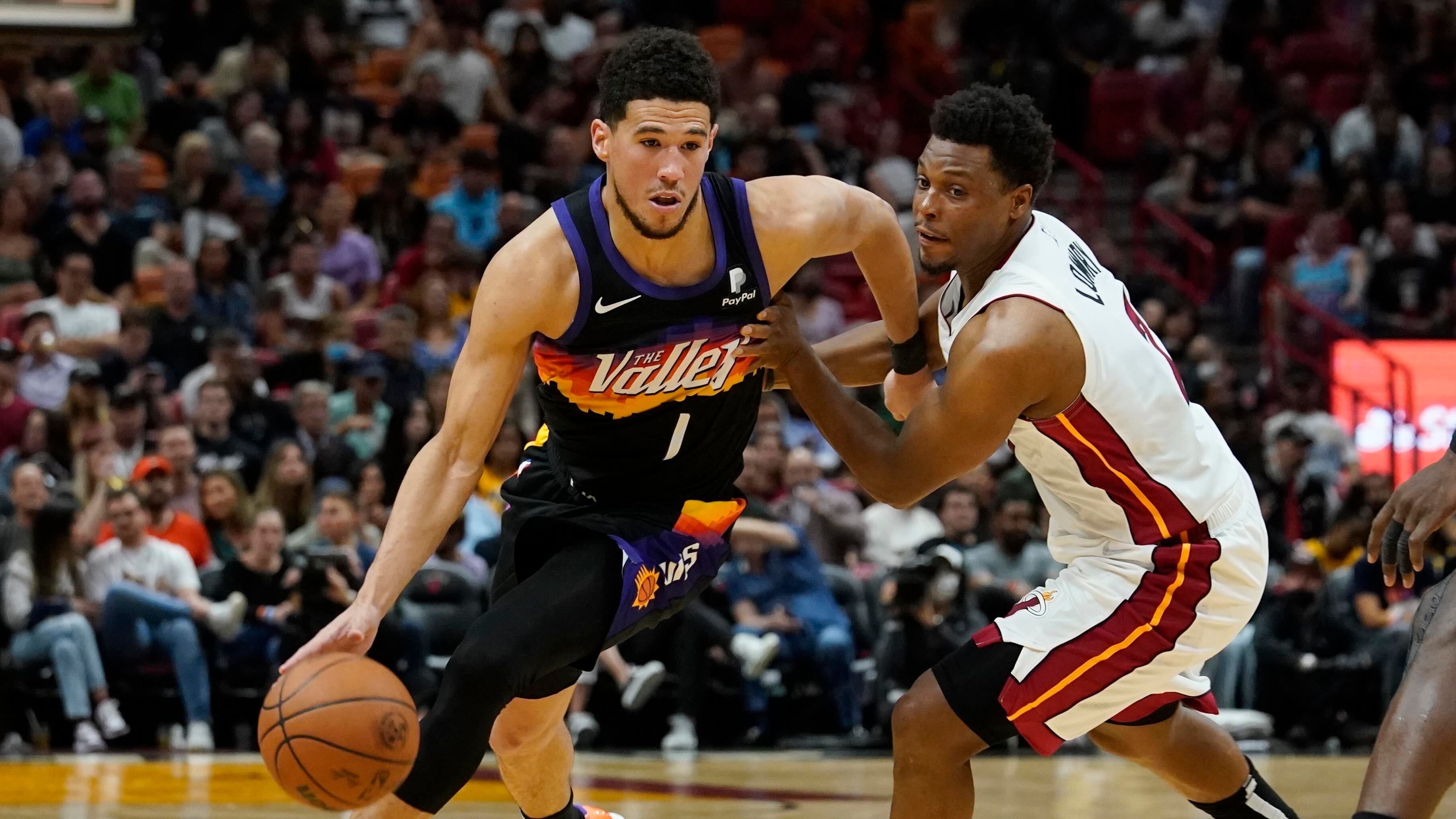 Devin Booker, de los Suns de Phoenix, elude a Kyle Lowry, del Heat de Miami, en el encuentro del miércoles 9 de marzo de 2022 (AP Foto/Marta Lavandier) Devin Booker, de los Suns de Phoenix, elude a Kyle Lowry, del Heat de Miami, en el encuentro del miércoles 9 de marzo de 2022 (AP Foto/Marta Lavandier) (Marta Lavandier/AP)