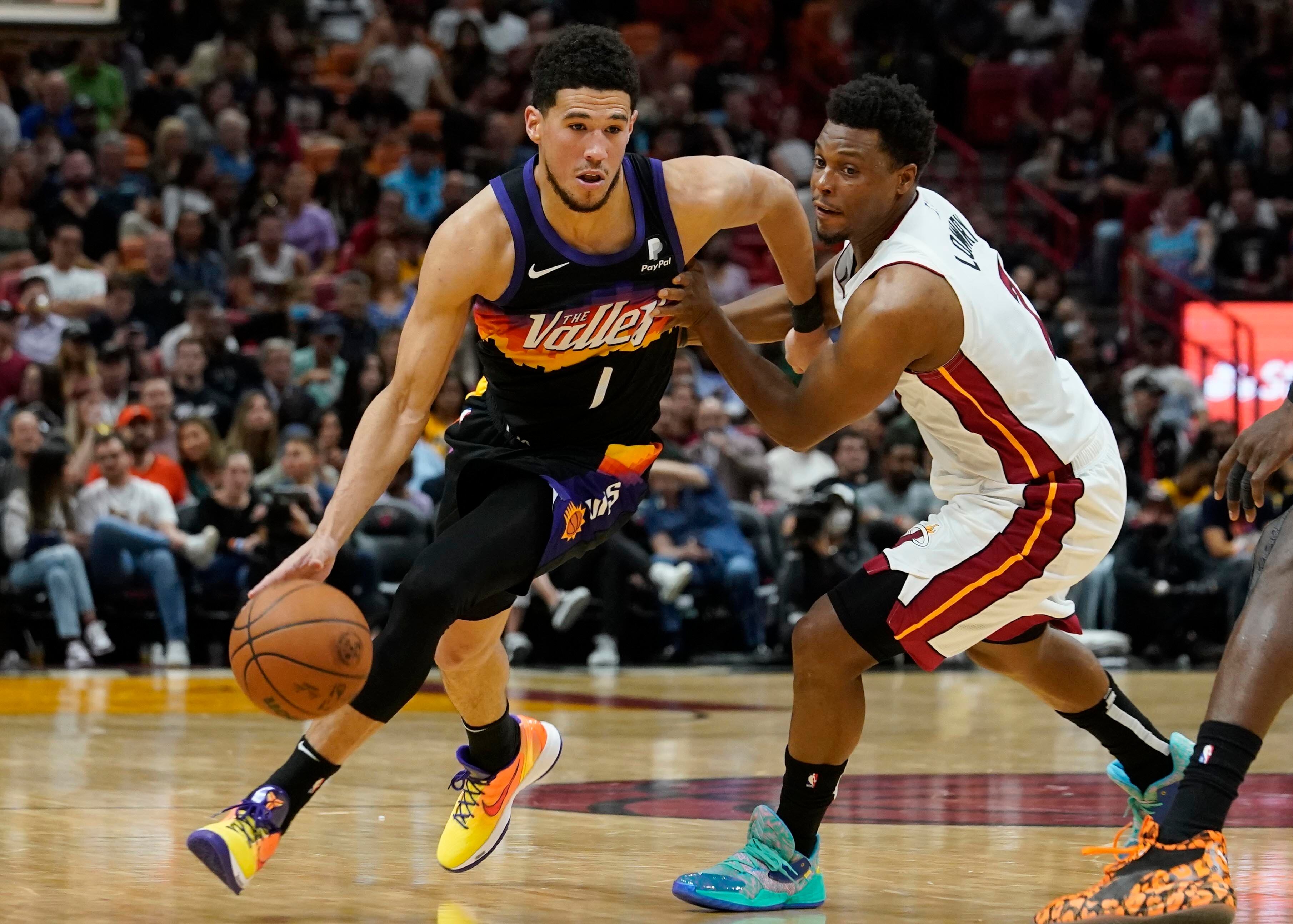 Devin Booker, de los Suns de Phoenix, elude a Kyle Lowry, del Heat de Miami, en el encuentro del miércoles 9 de marzo de 2022 (AP Foto/Marta Lavandier) Devin Booker, de los Suns de Phoenix, elude a Kyle Lowry, del Heat de Miami, en el encuentro del miércoles 9 de marzo de 2022 (AP Foto/Marta Lavandier) (Marta Lavandier/AP)