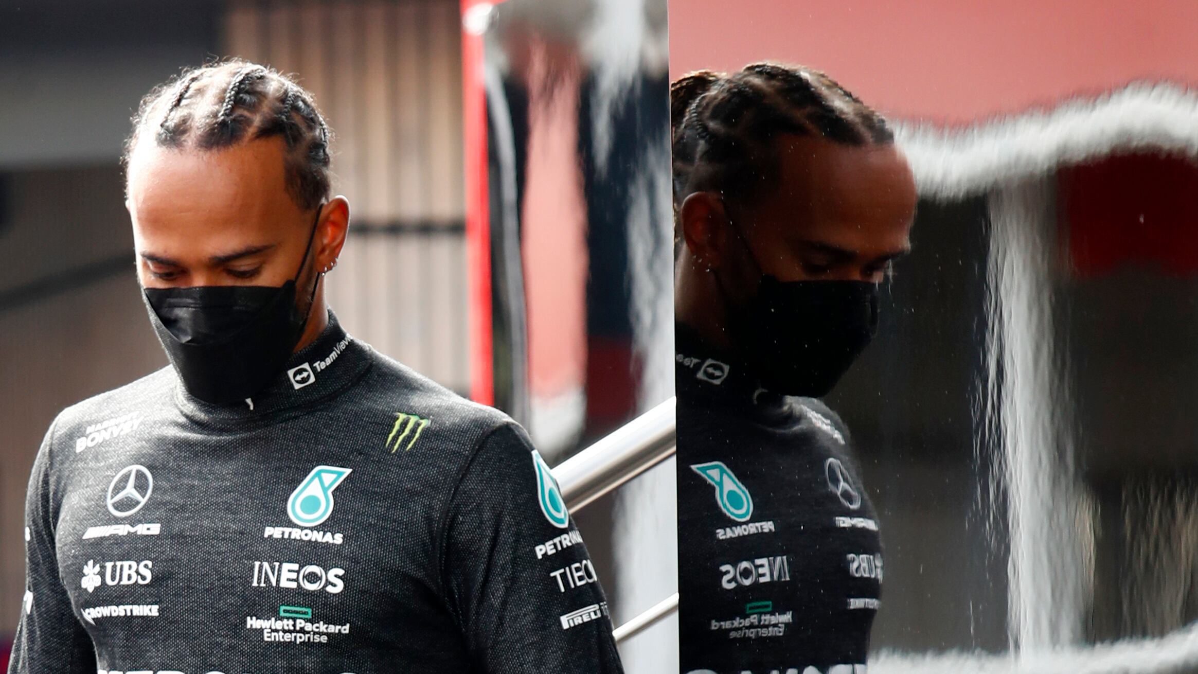El piloto de Mercedes Lewis Hamilton camina durante una sesión de prueba de la Fórmula Uno en Barcelona, el viernes 25 de febrero de 2022. (AP Foto/Joan Monfort) (Joan Monfort/AP)
