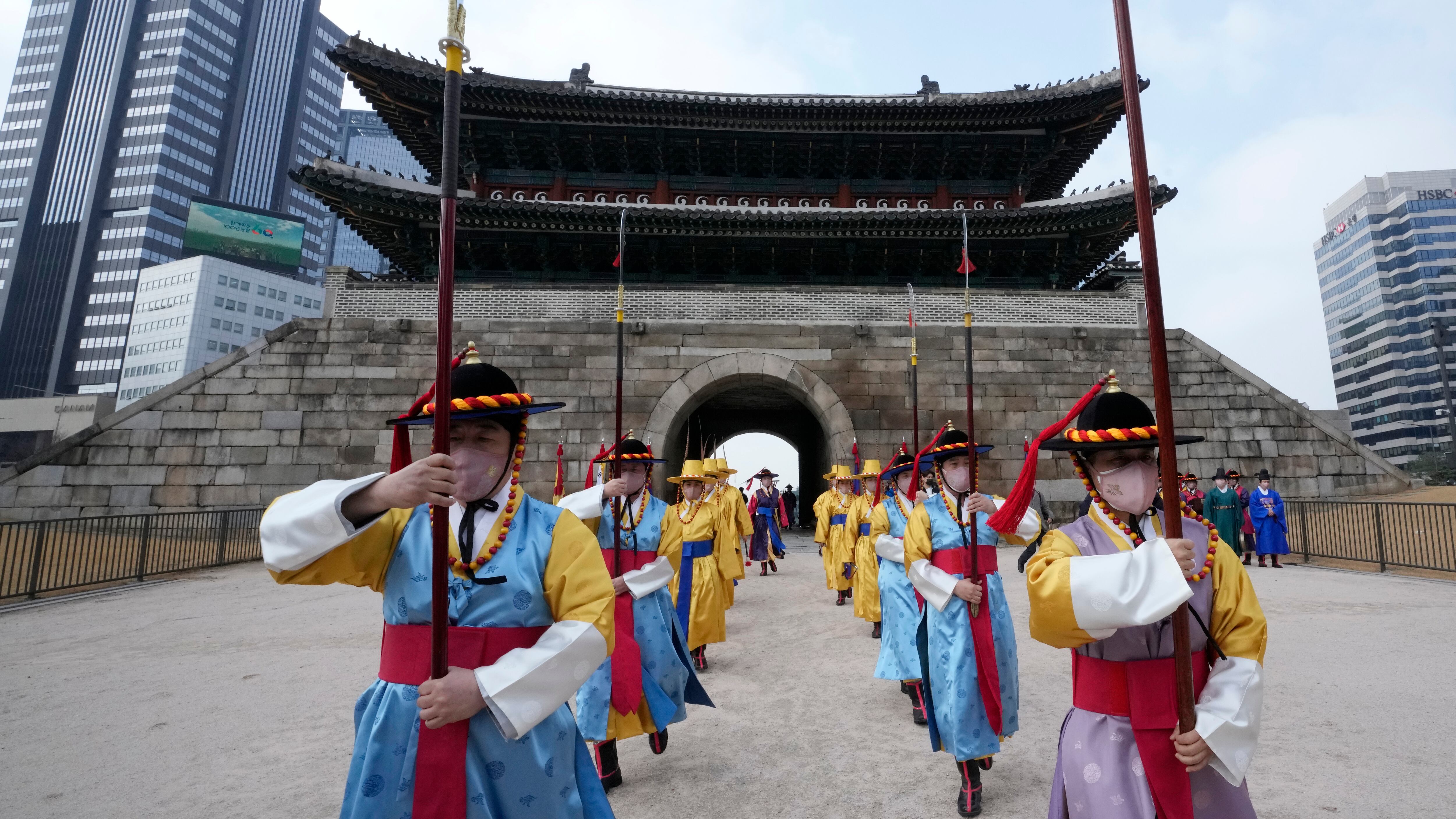 Actores con los uniformes tradicionales de la guardia y mascarillas para protegerse del coronavirus avanzan durante la apertura y cierre de la Puerta Sungnyemun, el martes 15 de marzo de 2022, en Seúl, Corea del Sur. (AP Foto/Ahn Young-joon) (Ahn Young-joon/AP)