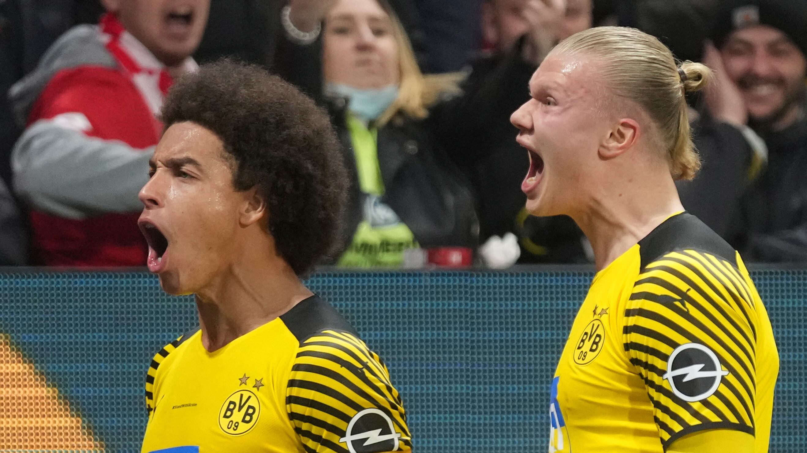 Axel Witsel (izquierda) del Borussia Dortmund celebra con Erling Haaland tras marcar el primer gol en ante Mainz en la Bundesliga, el miércoles 16 de marzo de 2022. (AP Foto/Michael Probst) (Michael Probst/AP)